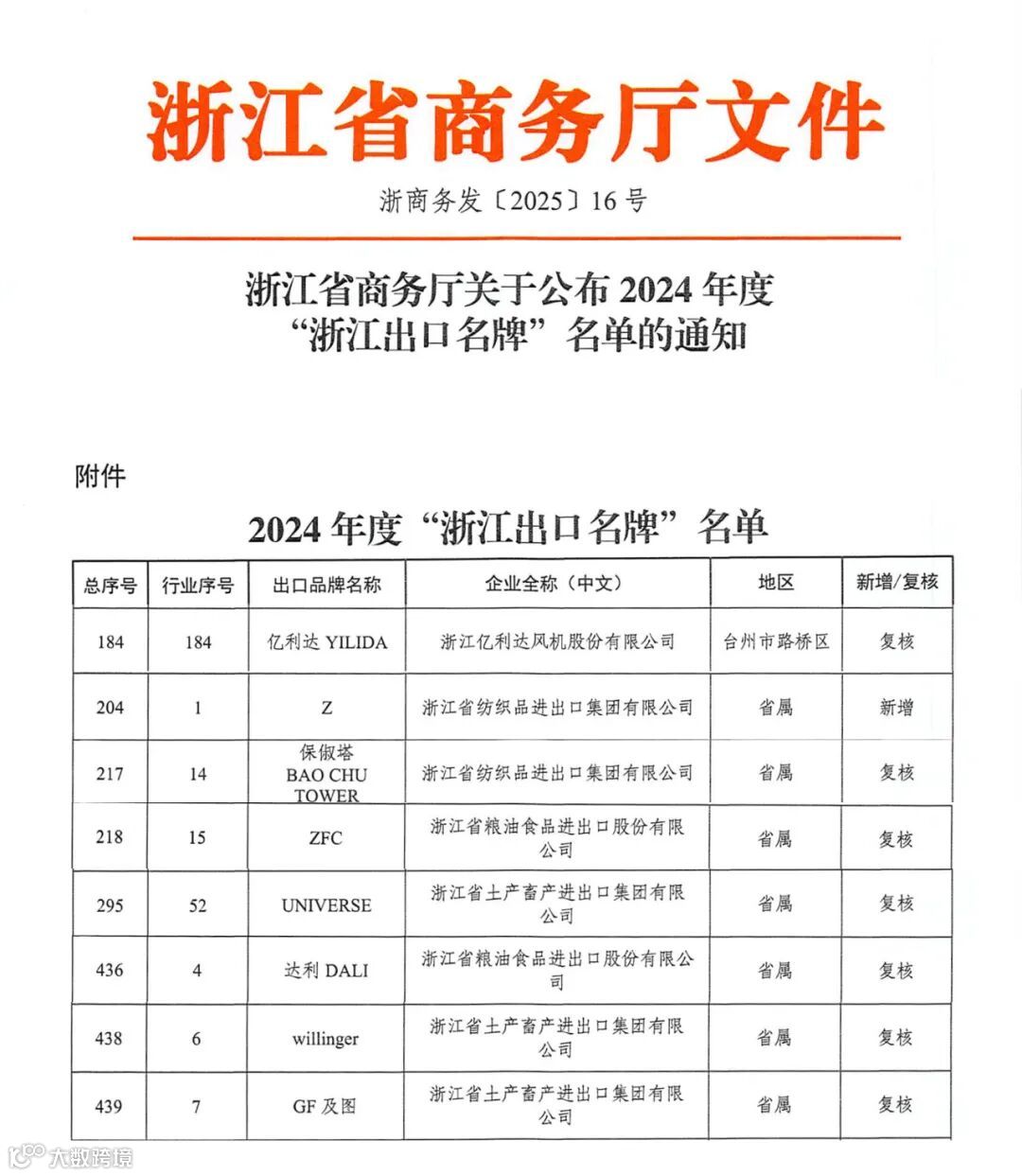 近日,浙江省商务厅公布最新2024年度“浙江出口名牌”名单,浙江土畜“UNIVERSE”、“Willinger”和“GF及图”,浙江粮油“ZFC”、“达利DALI”,浙纺集团“保俶塔”,浙商资产“亿利达”再次通过“浙江出口名牌”称号复核,浙纺集团“Z”首次获得“浙江出口名牌”称号。