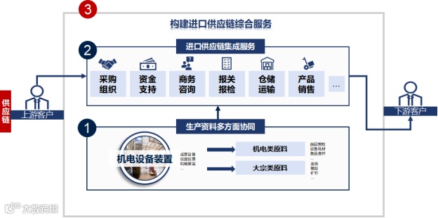 国际供应链致力于构建一套高效、全面且极具竞争力的进口供应链综合服务模式,全力构筑“原料+设备”协同的供应链综合服务、上下游环节延伸的机电进口供应链集成服务以及贴身式进口供应链综合服务三大服务。