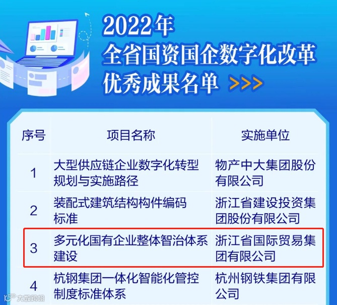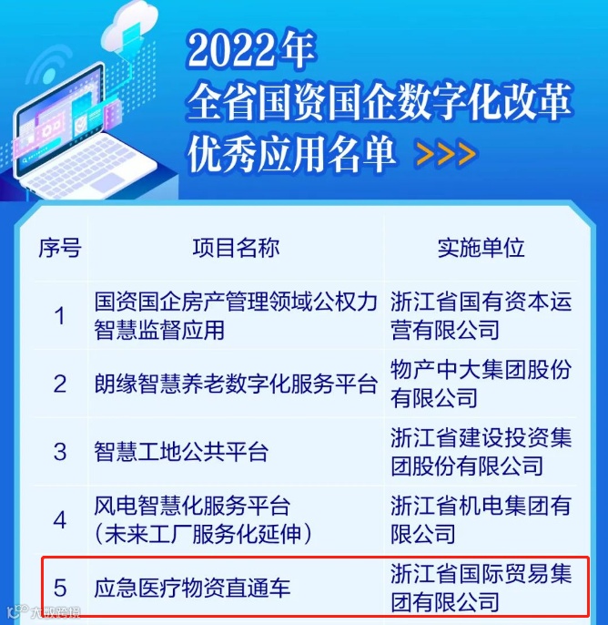 为激励引导全省国资国企在数字化改革上攻坚突破、争先创优,近日,2022年全省国资国企数字化改革优秀系列评选结果正式公布,本次评选确定优秀应用、优秀成果45项,其中,省国贸集团《多元化国有企业整体智治体系建设》项目入选全省国资国企数字化改革优秀成果,《应急医疗物资直通车》项目入选全省国资国企数字化改革优秀应用。