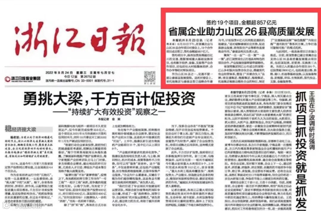 8月23日,以“共建共享共富”为主题的省属企业与山区26县合作项目对接会在杭州举行。会上,省国贸集团与江山市签订合作项目,共同成立注册资本10010万元的国贸·江山乡村振兴投资合伙企业,搭建现代农业经营体系构想,塑造“共富合伙人”品牌。据了解,省属企业与山区县成功签订合作项目共19个,签约金额超857亿元。