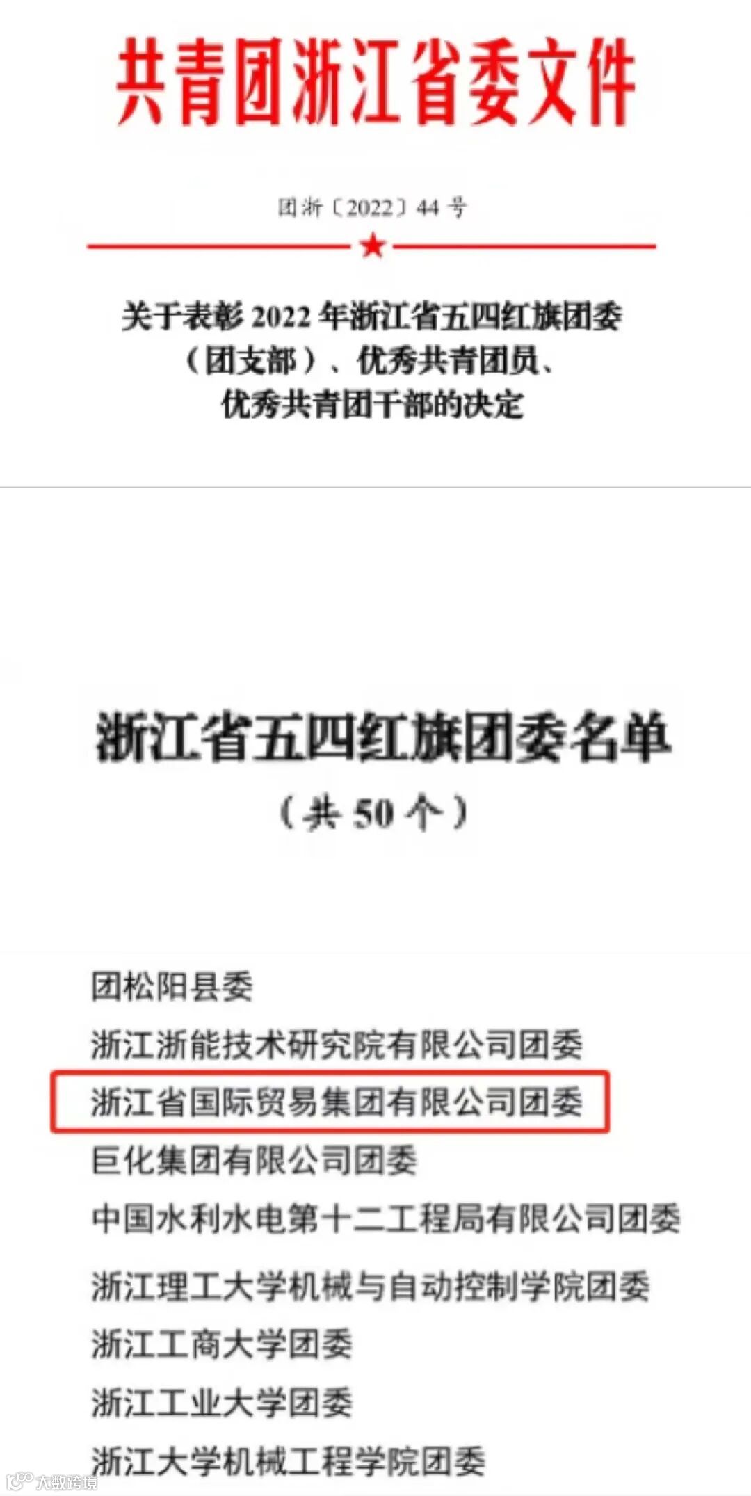 近日,共青团浙江省委授予了50个团组织浙江省五四红旗团委称号,浙江省国际贸易集团有限公司团委荣获2022年浙江省五四红旗团委。