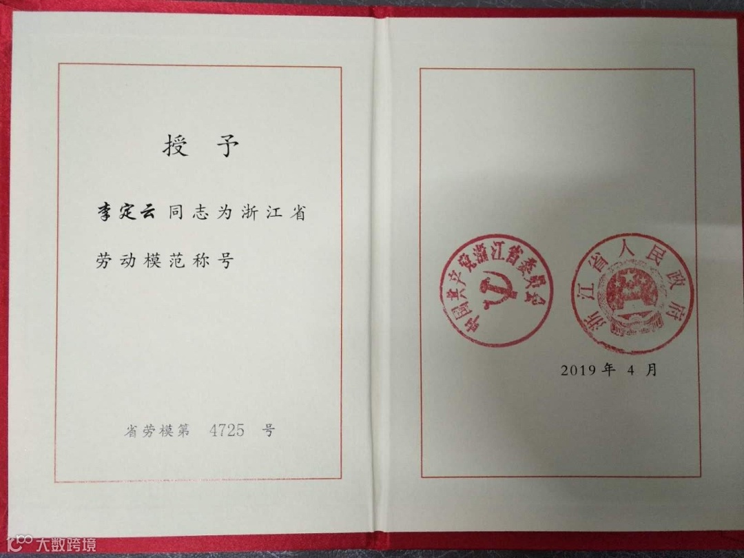图:李定云获2019年“浙江省劳动模范”称号
