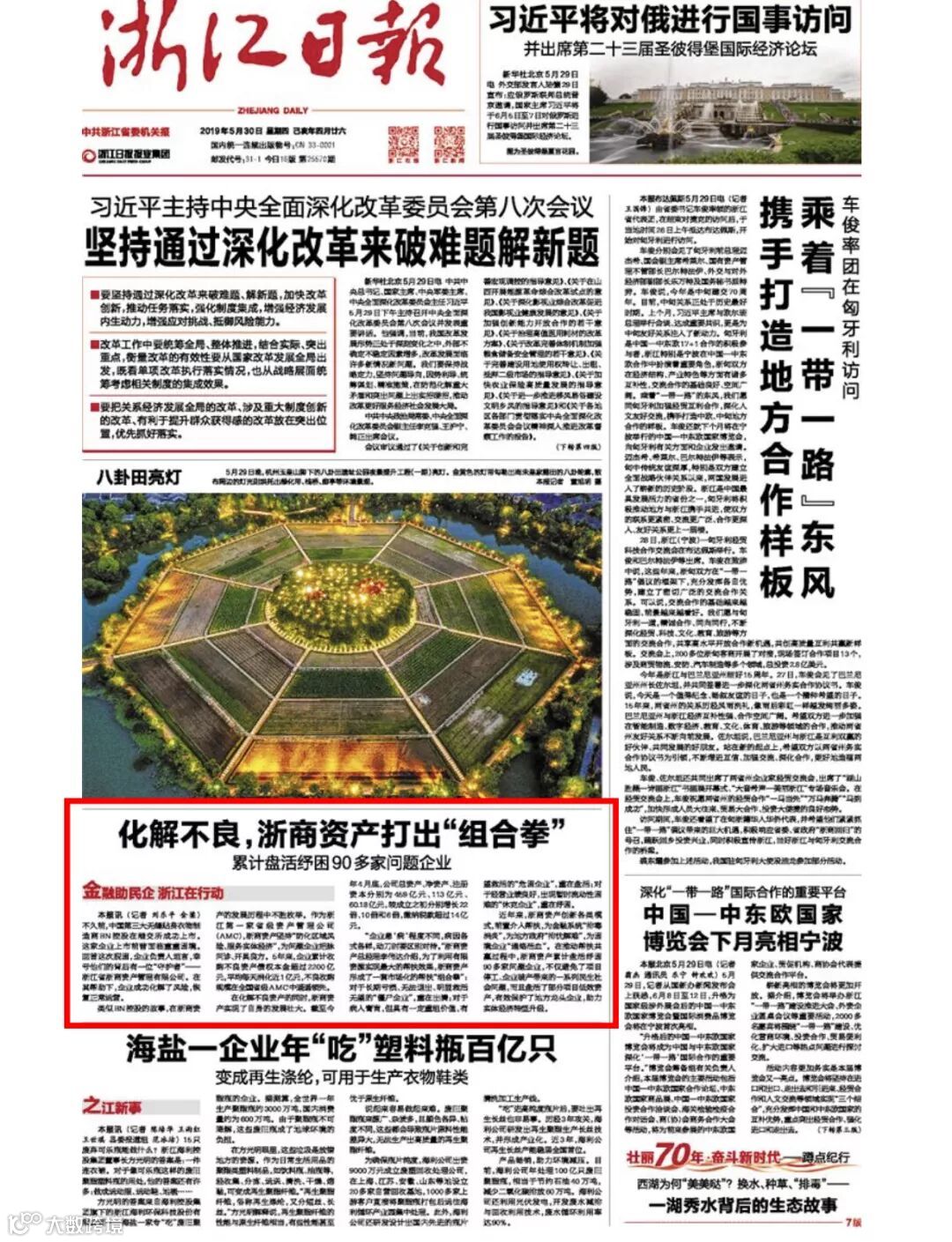 浙江日报头版刊登《化解不良,浙商资产打出组合拳》
