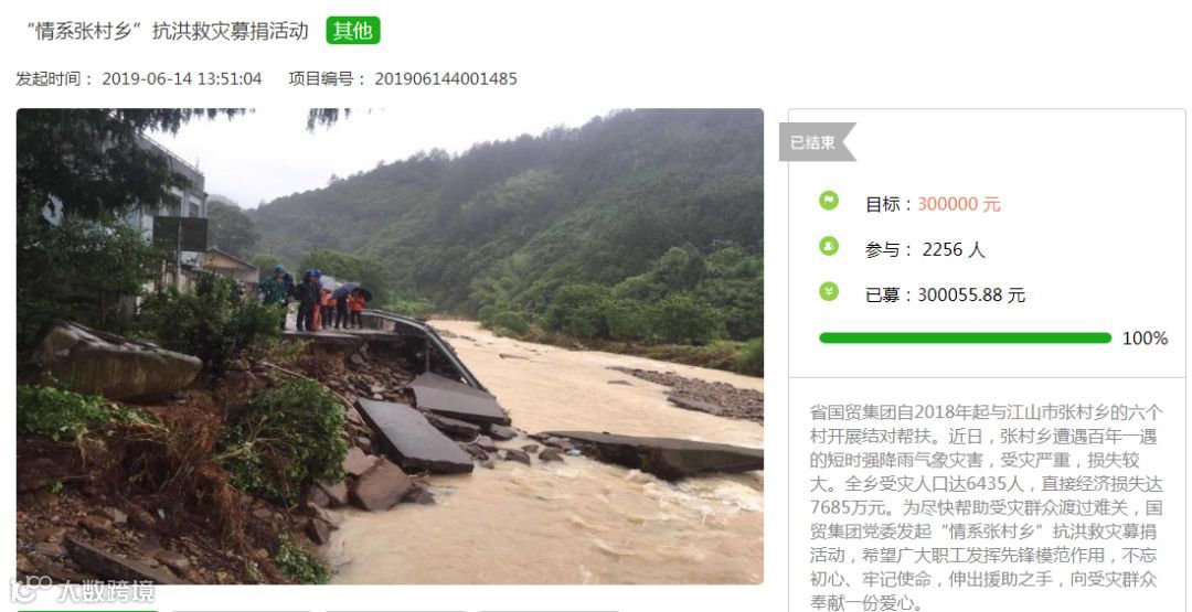 与集团结对“消薄”的江山市张村乡遭遇百年一遇的洪灾,集团党委发动职工募捐等多方式火速支援江山市张村乡抗洪救灾;