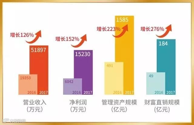 2017年是浙金信托突破发展的一年,也是夯实基础的一年,成功装入浙江东方上市公司,注册资本由5亿元增至17亿元。与2016年相比,2017年各项主要经营指标均大幅增长,其中营业收入增长168%、净利润增长152%、管理资产规模增长223%、财富直销规模增长276%。