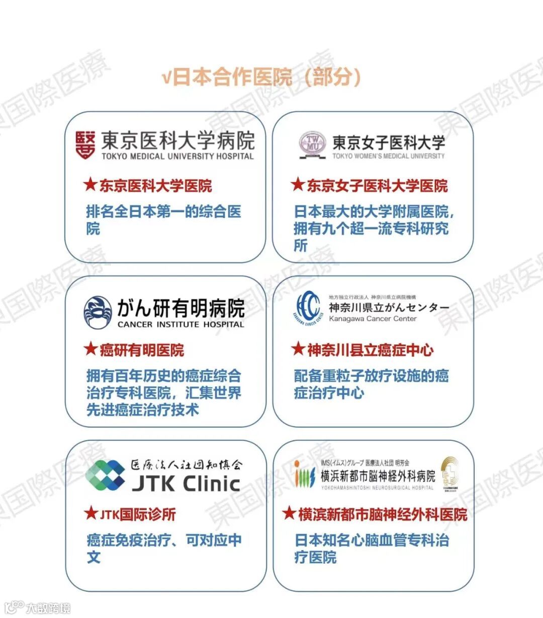 东康国际医疗在日本东京及中国北京均有公司,从事海外医疗服务多年,合作日本当地医疗机构数十家,如:东京医科大学医院、圣路加国际医院、JTK国际诊疗院、东京女子医科大学附属医院、癌研有名医院、神奈川县立癌症研究中心等,可为不同需求的客户提供医疗服务,包括但不限于各病症专科远程问诊、赴日治疗(可办理医疗签证)、精密体检等。截至目前,东康国际医疗已服务个人及团体总计近千余人次。如有相关需求,欢迎联系咨询。