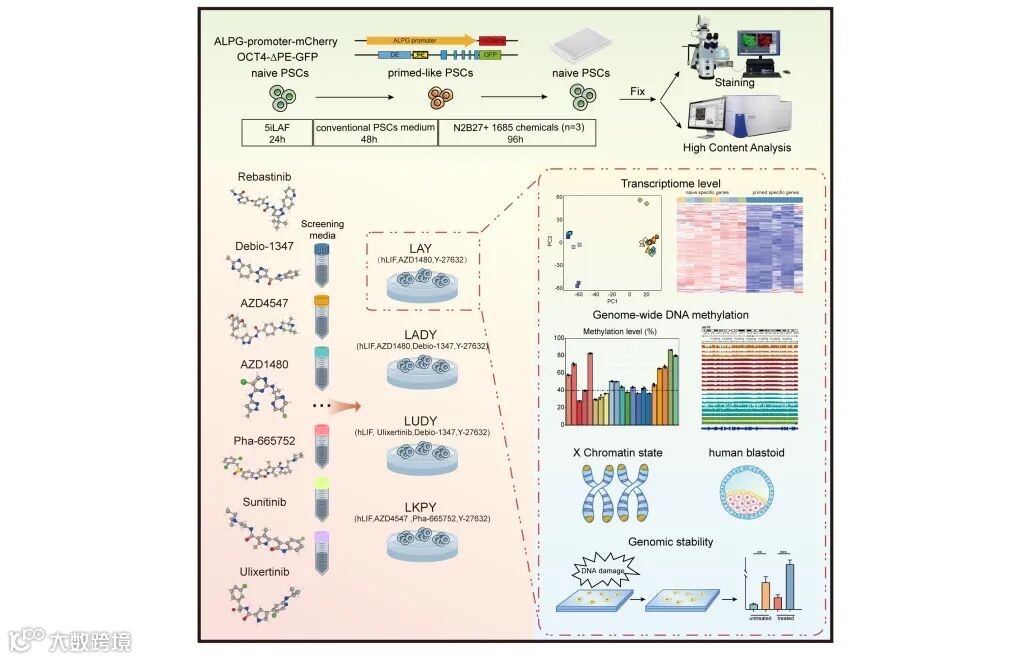 COVER STORY: Along the sun-drenched shoreline where waves dance with the rhythm of the ocean. Scattered across beach are numerous stones symbolizing over 1,600 distinct small molecules. Much like prospectors panning for gold in a riverbed, four optimized culture systems—LAY, LADY, LUDY, and LKPY—have been identified. Among these, cells cultured in the LAY system exhibit enhanced genomic stability. This research significantly advances the robust induction and long-term maintenance of naïve pluripotency, offering crucial insights for the future application of naïve hPSCs in therapeutic and regenerative contexts.