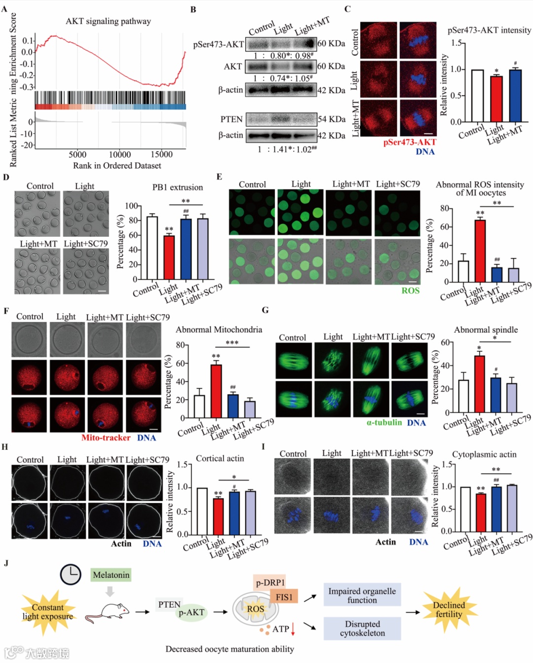 研究证实,光照处理后,小鼠的发情周期紊乱、节律基因表达异常、后代产仔数及存活率显著下降,这可能是卵母细胞成熟质量降低导致的,而褪黑素补充能有效挽救上述不良表型。采集卵母细胞进行转录组GO分析,结果显示差异基因显著富集于内质网蛋白质加工、细胞骨架组装及细胞器动力学,特别是线粒体的结构与功能调控过程。进一步研究证实,光照处理后卵母细胞线粒体核周定位减少,膜电位下降,FIS1/p-DRP1介导的线粒体分裂过程遭到抑制,ATP水平显著下降。同时,与线粒体密切相关的细胞器内质网和高尔基体的功能也被破坏,暗示了昼夜节律紊乱影响卵子的胞质成熟过程。外源线粒体靶向抗氧化剂MitoQ添加能有效缓解线粒体和高尔基体的定位和功能异常,表明线粒体功能在昼夜节律紊乱导致的卵子成熟障碍中起核心作用。进一步筛选预测发现PETN/AKT信号通路是昼夜节律紊乱影响卵子质量的潜在核心靶点,GSEA富集分析、蛋白免疫印迹和荧光标记进一步证实AKT水平和活性均在昼夜节律紊乱小鼠卵母细胞中显著下降。AKT激活剂SC79外源补充能够提高昼夜节律紊乱小鼠卵母细胞的成熟率,并降低氧化应激水平、缓解线粒体异常分布,并保护卵子细胞骨架的组装。