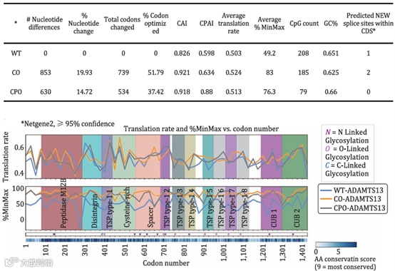 图示:通过密码子(CO)和密码子对(CPO)优化策略进行的同义基因重编码影响了ADAMTS13的表达、结构、稳定性、细胞生物能学、翻译后修饰(PMTs)和免疫原性。因此,需要对重编码的转基因进行仔细评估,因为这可能会揭示出不希望的蛋白质特性。