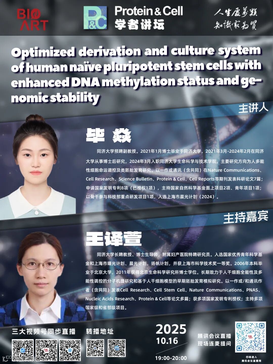 本次学术分享者为同济大学毕焱副教授,报告题目为:Optimized derivation and culture system of human naïve pluripotent stem cells with enhanced DNA methylation status and genomic stability。本期主持嘉宾是来同济大学的王译萱教授。