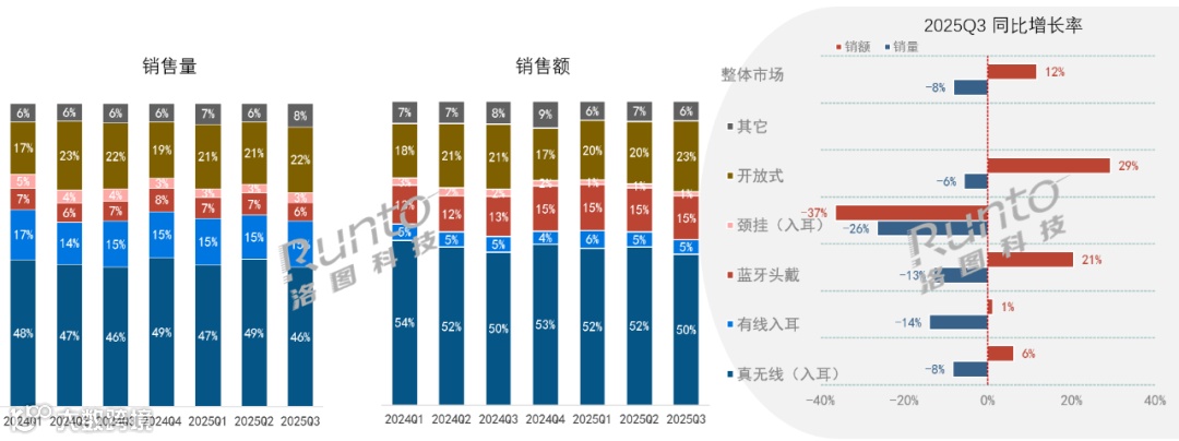 根据洛图科技(RUNTO)线上数据显示,在传统主流电商平台上,开放式和蓝牙头戴耳机在2025年第三季度的销售额增速分别为29.4%和20.6%,是推动整体市场销额增长的主要驱动力。