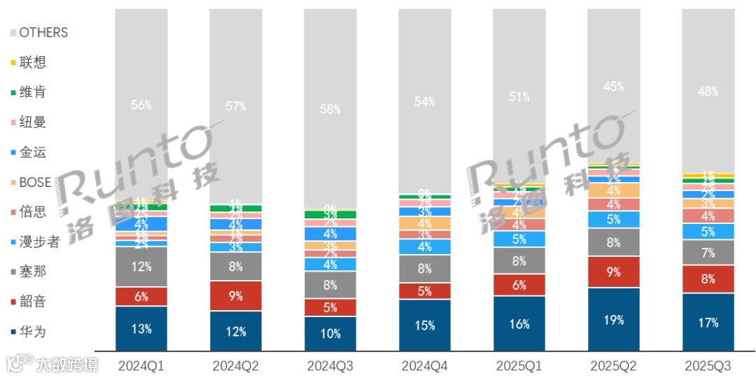 相比长期发展已经稳定的蓝牙头戴和真无线入耳市场,作为新兴赛道的真无线不入耳耳机市场正在重塑着品牌的竞争格局,国内厂商通过高效的供应链管理、技术创新、AI赋能正在成为该细分市场的主导力量。