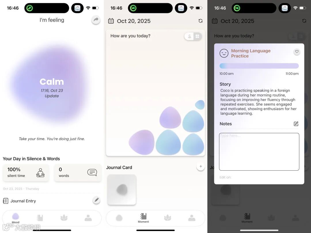 它有一个类似「自动日记」(Auto-Journal)的功能,能自动标记一天中情绪波动最显著的时刻,用户无需手动记录,只需在一天结束后打开 App 回顾这些被高亮标记的「情绪节点」,并通过反思(例如「下午 2:15 情绪下降,原来是在处理一点棘手的工作」)来发现自己独特的情绪模式和压力触发点。