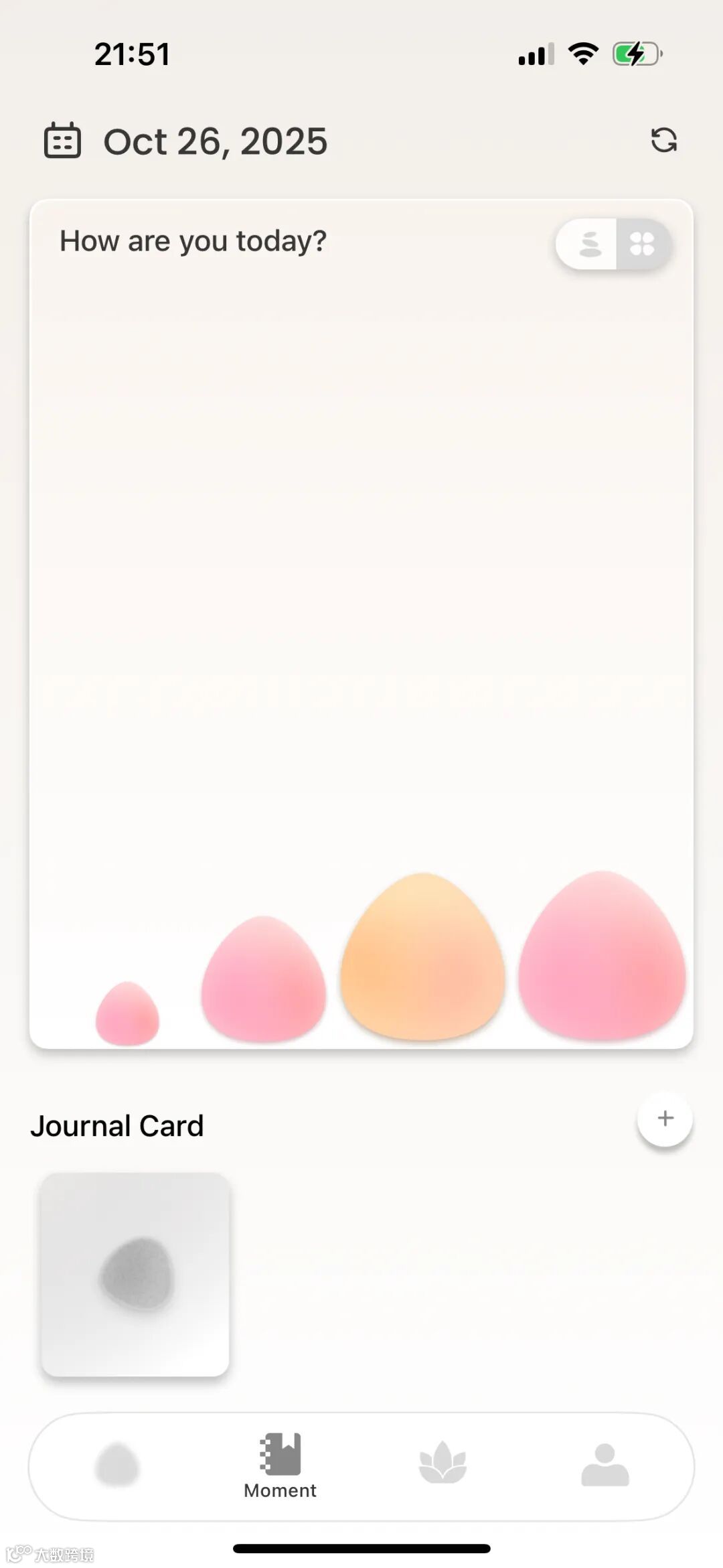 在 App 中,一个名为「Moment」的页面扮演了核心角色。它像一个「小罐罐」,每小时会自动掉落一个鹅卵石形状的「小球」。小球的颜色代表了你这一个小时的总体情绪状态。点开这个小球,用户不仅能看到情绪的变化曲线,还能看到「这一个小时里面发生的一些重要事件」。