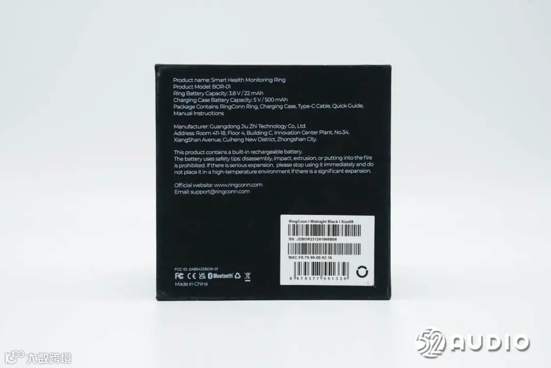 包装盒底部标注了产品和认证信息。型号:BOR-01,戒指电池容量:3.8V/22mAh,充电盒电池容量:5V/500mAh。