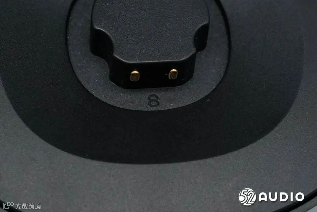 连接充电盒充电的金属连接器和中间的检测灯特写。