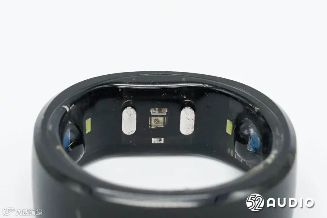 智能戒指内圈的健康检测传感器和充电触点特写。两侧传感器凸起,佩戴上会有一定的压迫感。