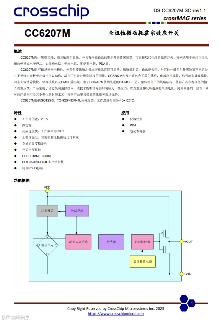 CrossChip芯进CC6207M全极性微功耗霍尔效应开关,用于感知充电盒开/关盖时的磁场变化,进而实现开盖戒指回连手机,关盖断开连接功能。