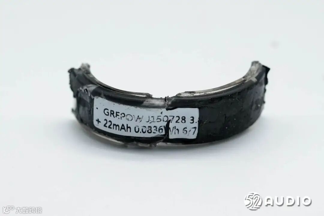 戒指内部搭载的锂电池特写,型号:J150728,容量:22mAh 0.0836Wh,来自GREPOW格瑞普。