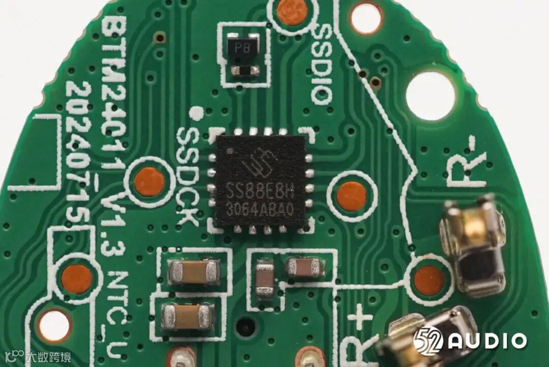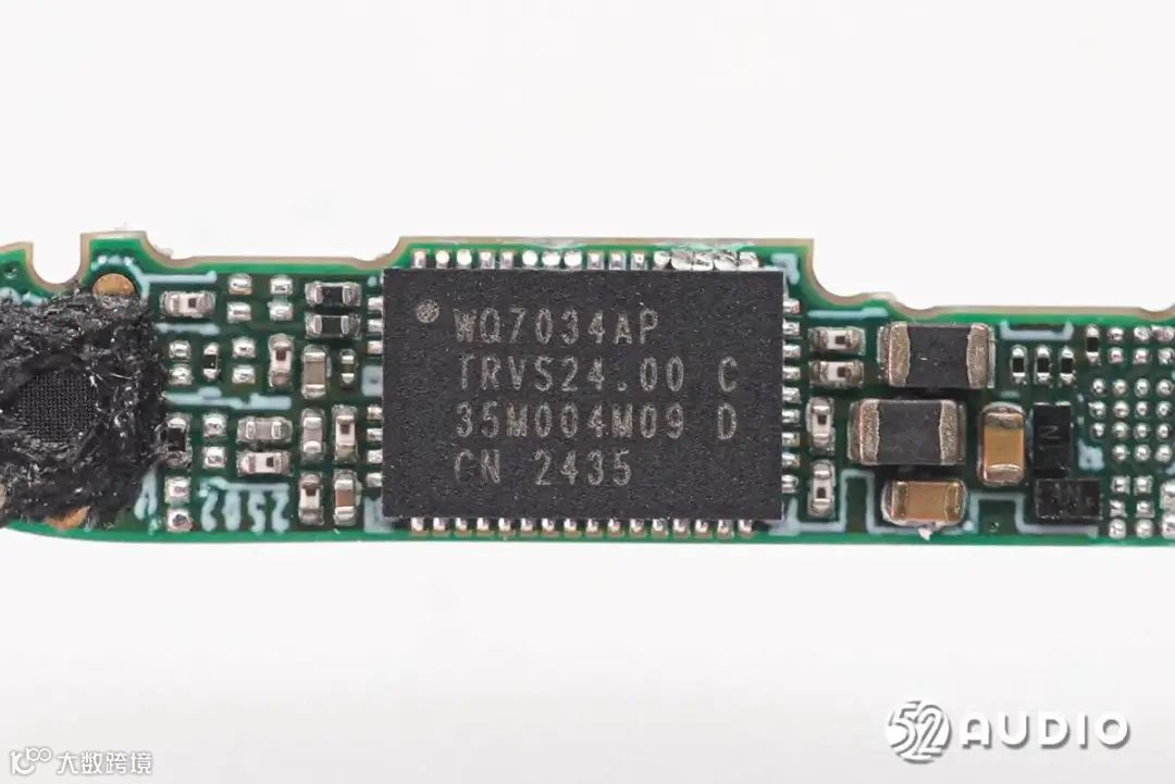 耳机搭载的WUQI物奇WQ7034系列蓝牙音频SoC,用于无线连接和音频数据处理。