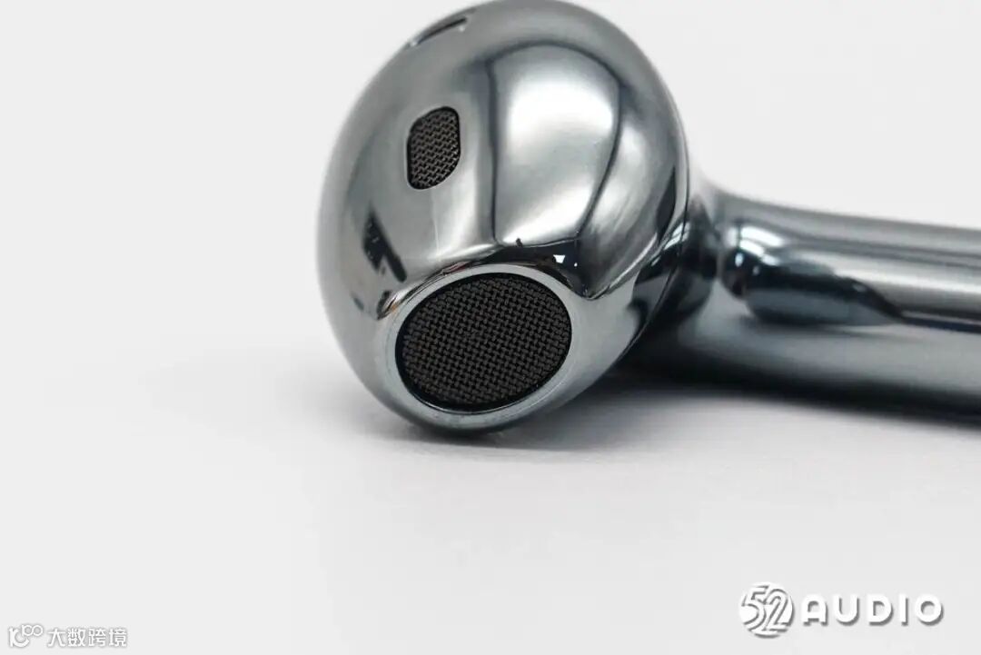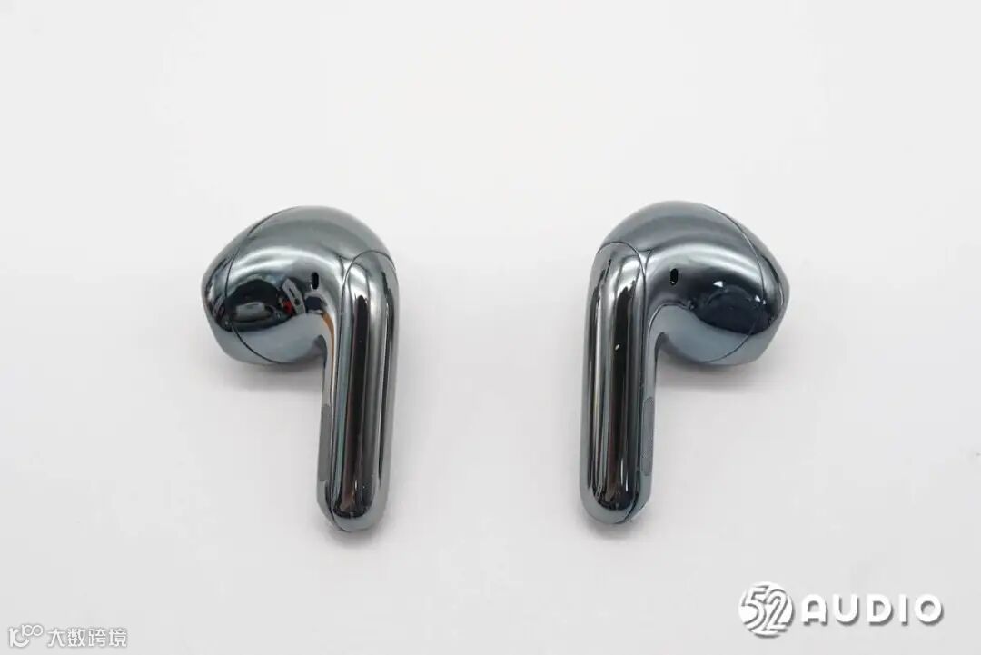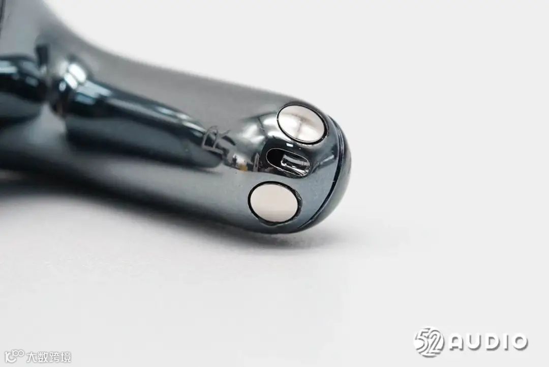 耳机外侧外观一览,机身曲线圆润无棱角。耳机柄侧边设置压感按键,捏一捏实现多功能控制。