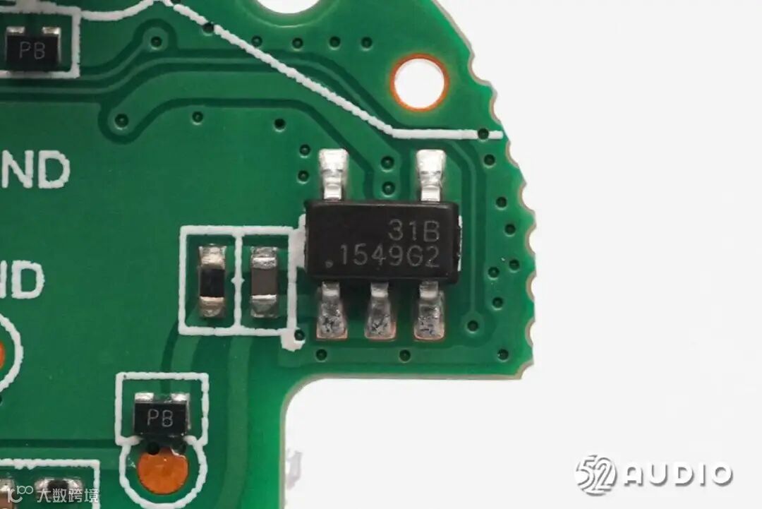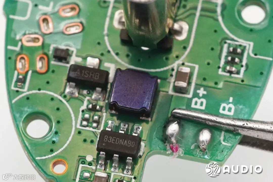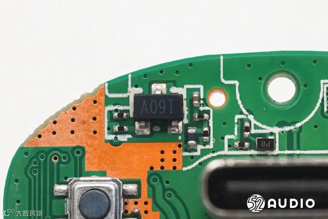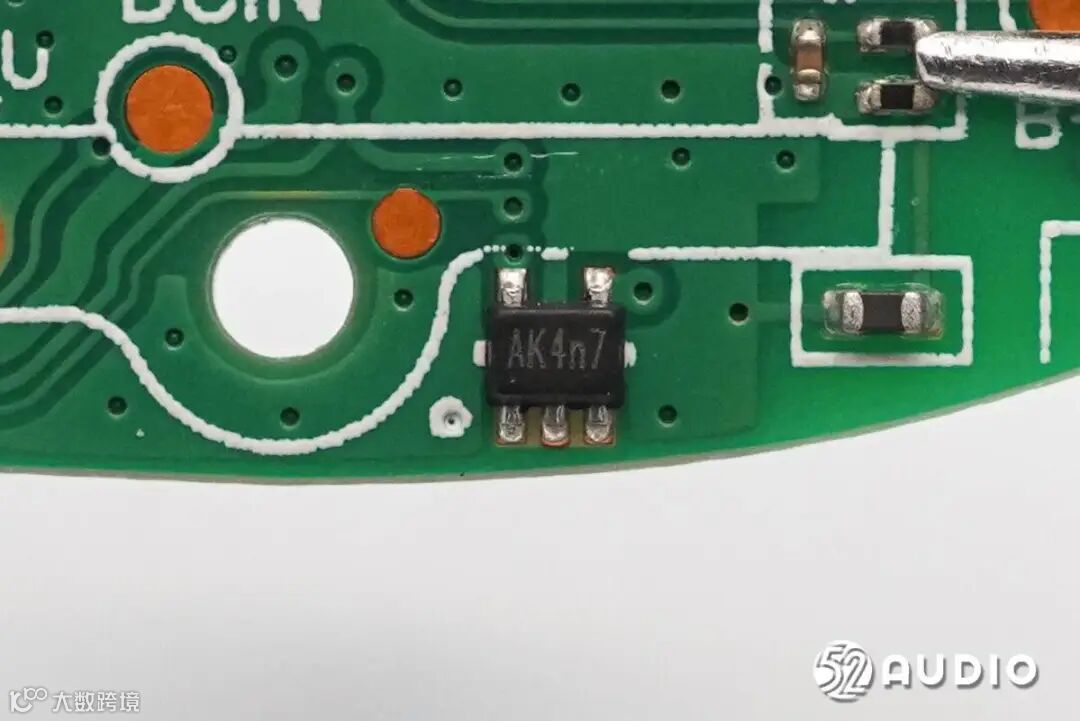 丝印AK4n7的霍尔元件,用于感知充电盒开启/关闭时的磁场变化,进而通知充电盒MCU和耳机与已连接设备配对或断开连接。