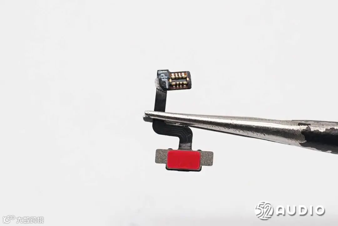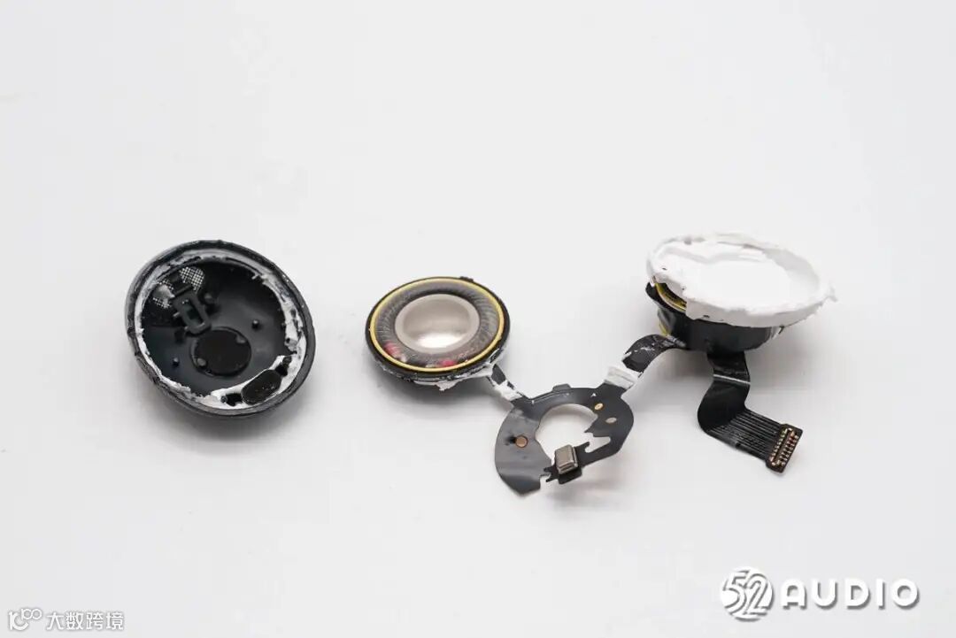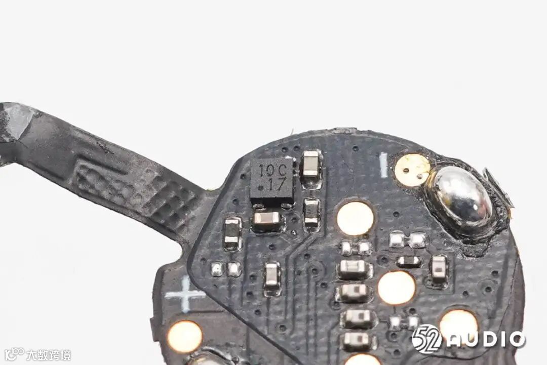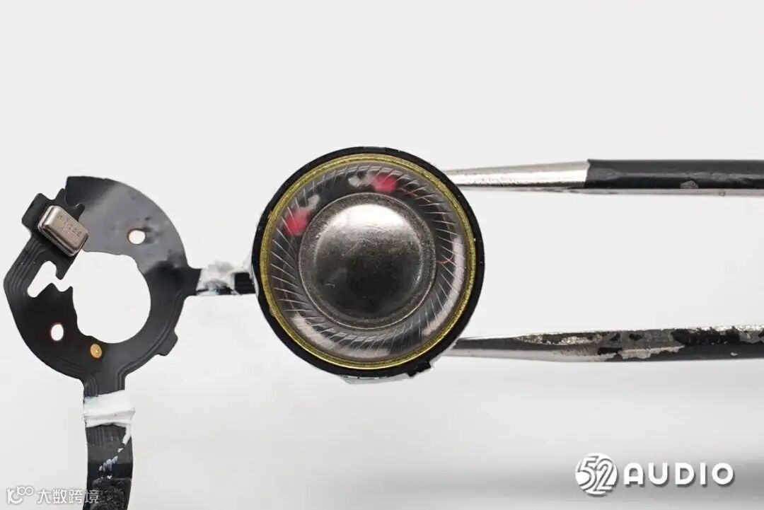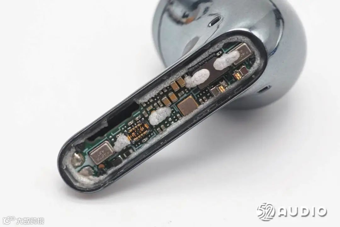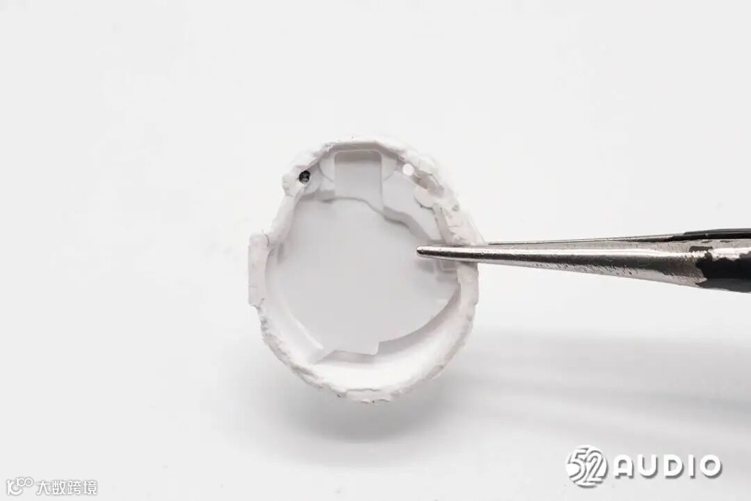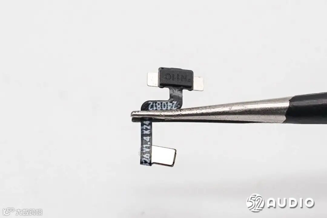 掀开扬声器,前腔底部贴有电容式入耳检测传感器,设置有后馈降噪麦克风。