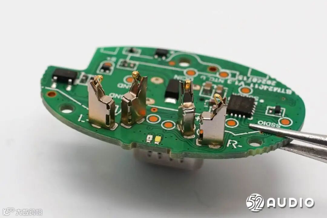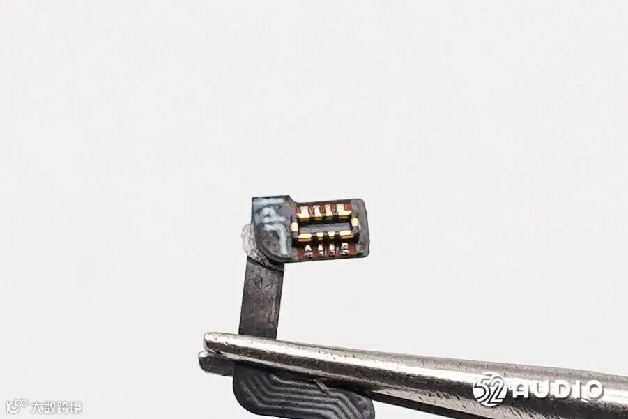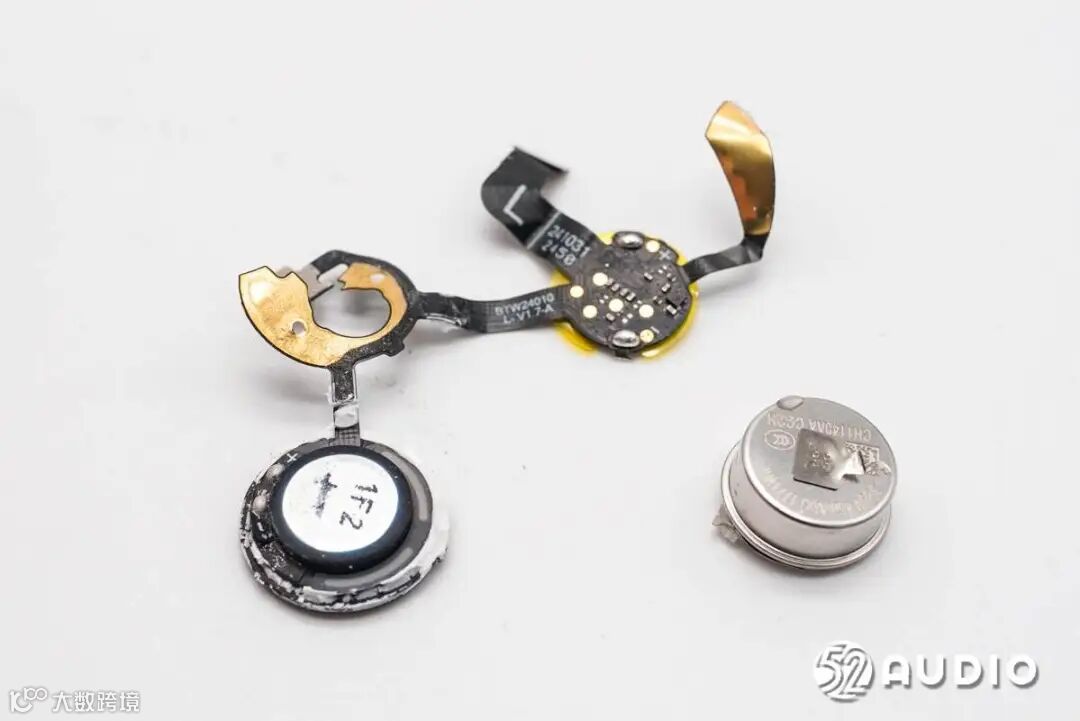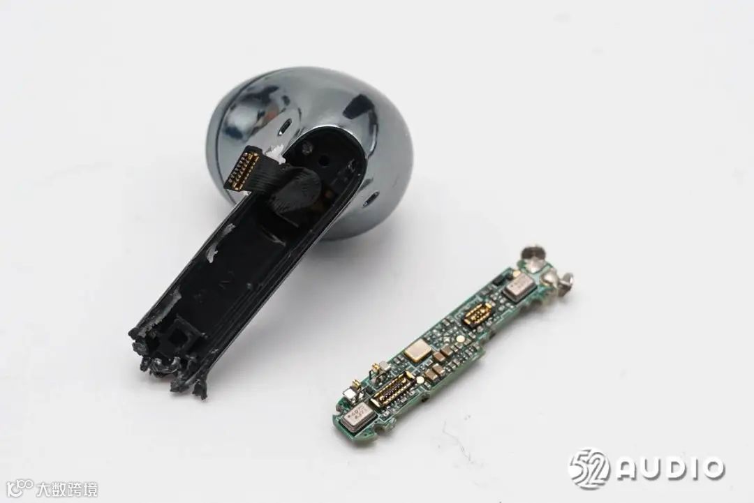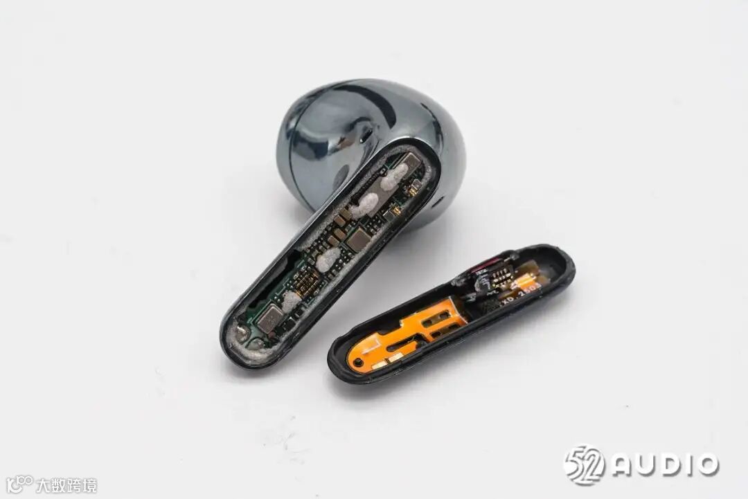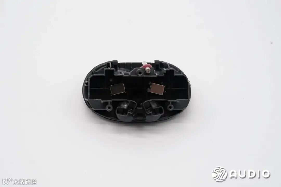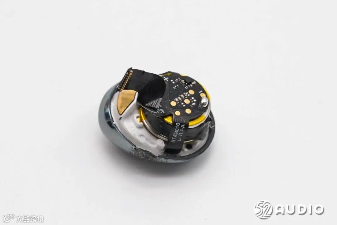 掀开扬声器,前腔底部贴有电容式入耳检测传感器,设置有后馈降噪麦克风。