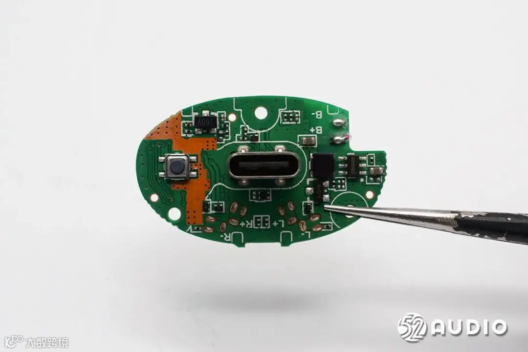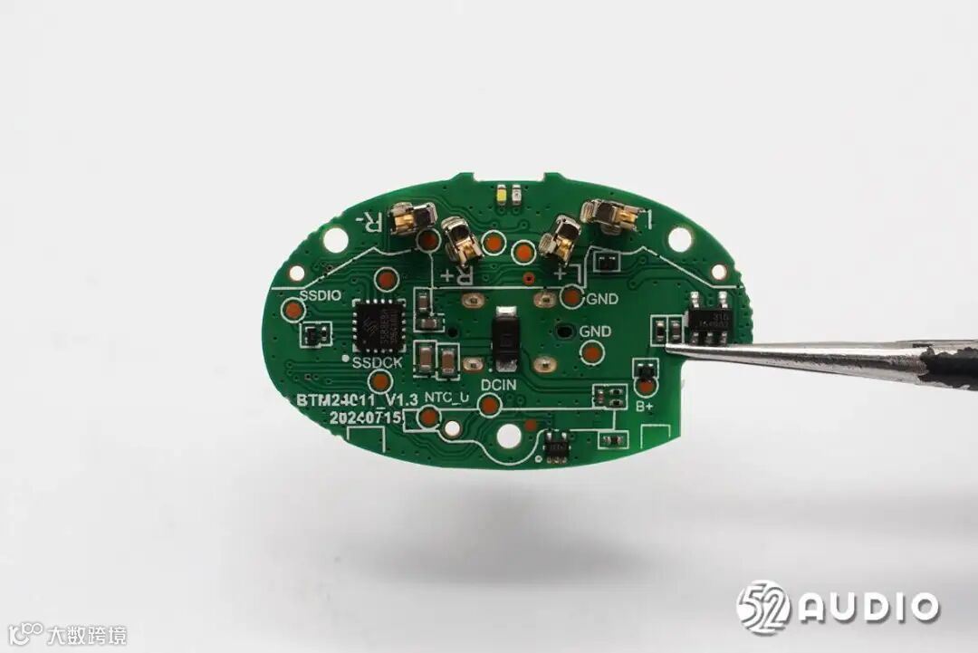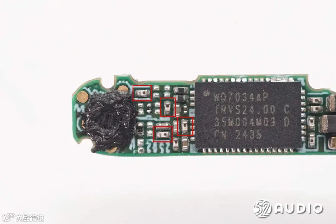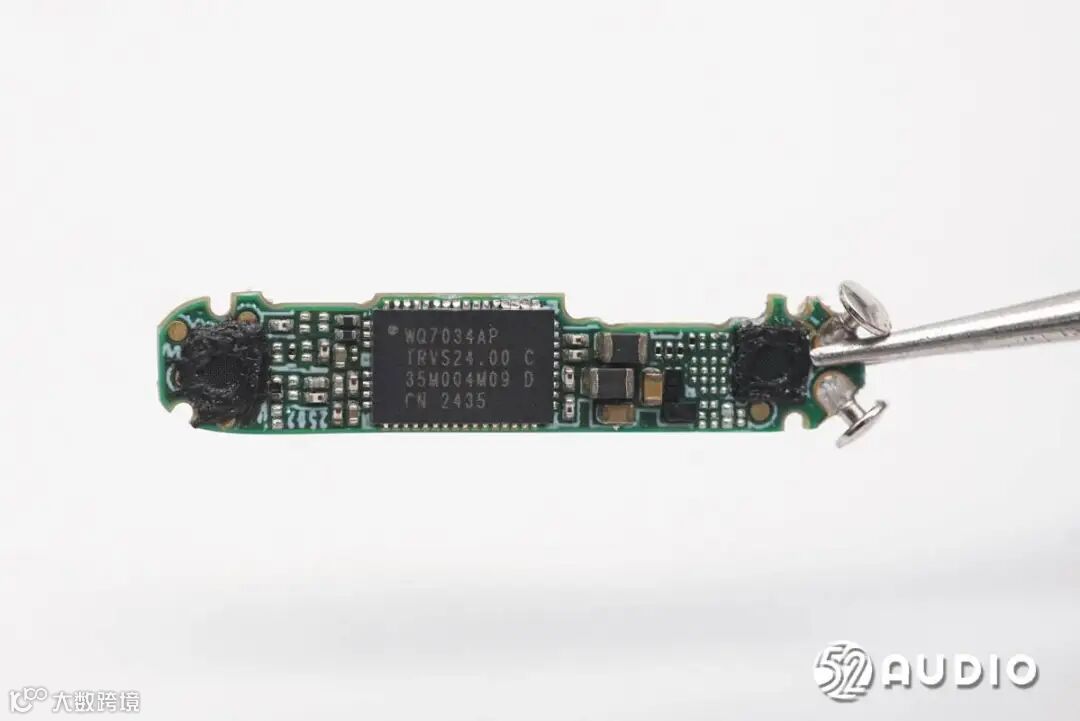 内部主要配置方面,耳机内置46mAh/3.85V钢壳扣式电池,搭载了13mm动圈单元和3颗MEMS麦克风(双耳6颗);采用了WUQI物奇WQ7034系列蓝牙音频SoC,Sunlord顺络电子SDCL0603Q系列叠层陶瓷电感和MPHM系列功率电感,WINSEMI稳先微WSDF2310C锂电保护IC等方案。