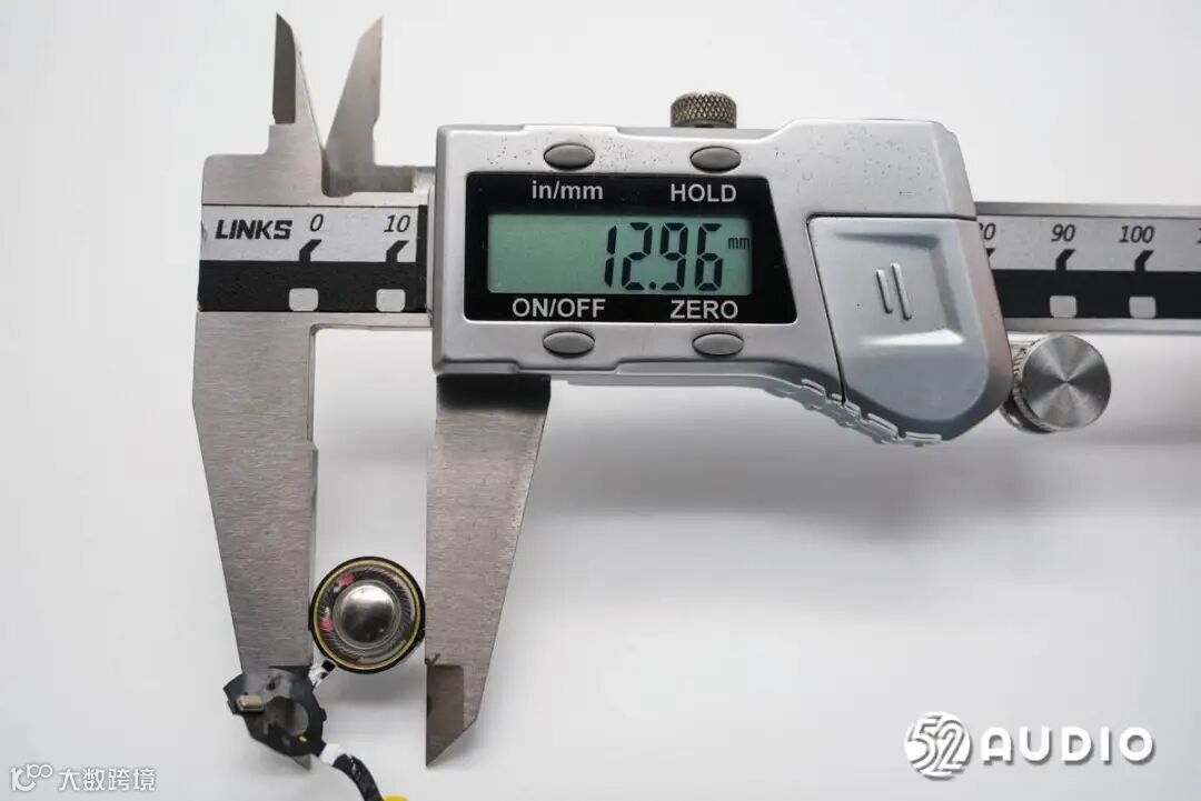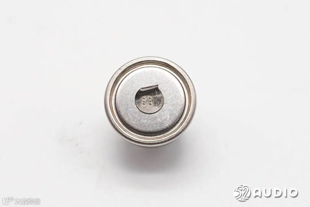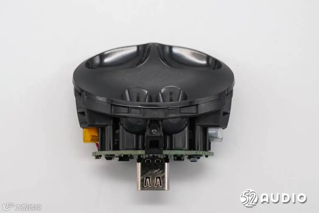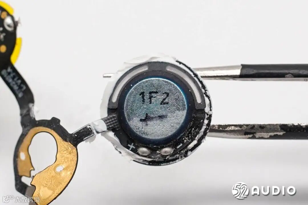 耳机扬声器正面特写。据官方介绍,采用了TPU+Ti航钛金属复合振膜,实现0.4mm超大振幅和16Hz~40kHz的超宽频响范围。其中柔软的TPU拥有更大振幅,具备更强低频下潜性能;航钛镀层则更轻反应更灵敏,可精准表现中高频细节。