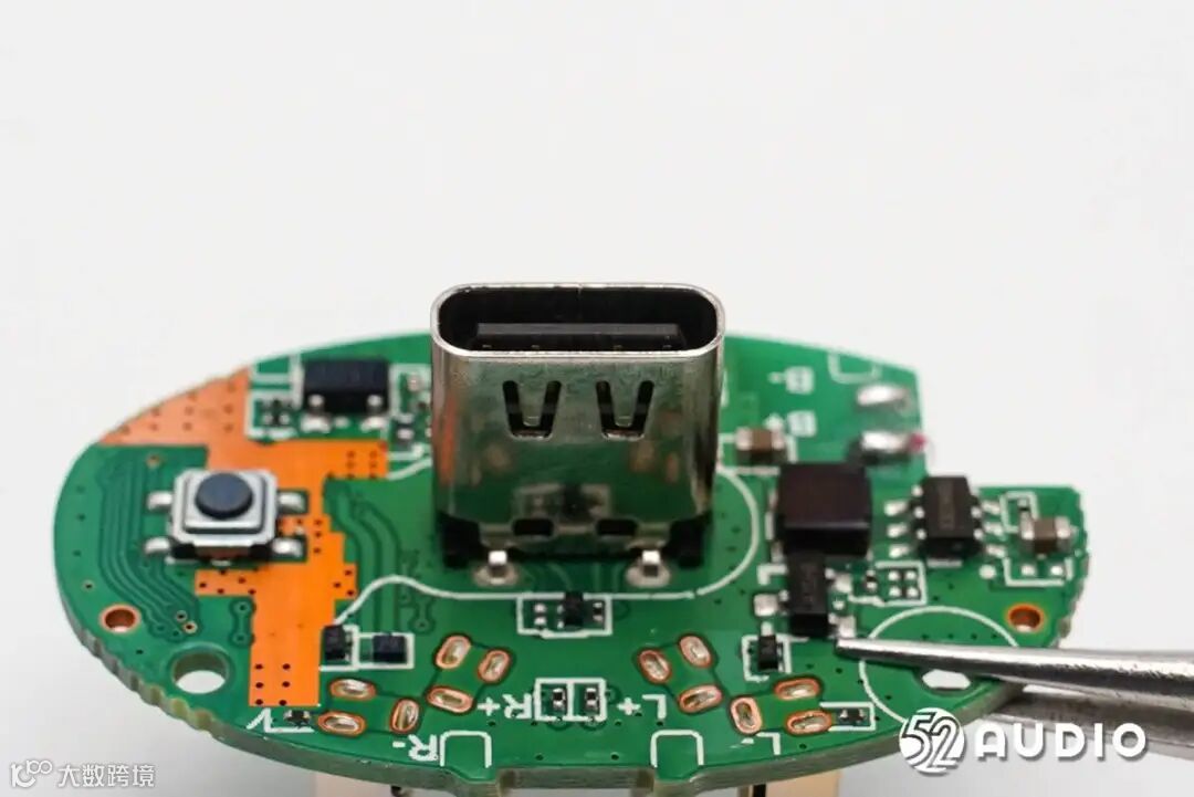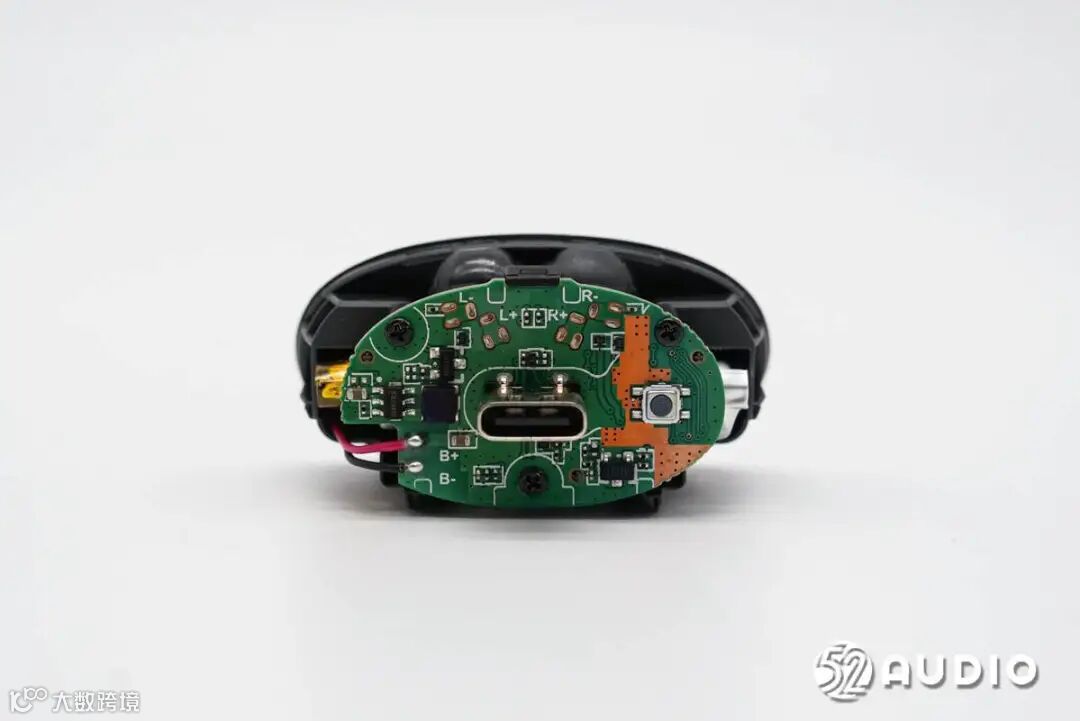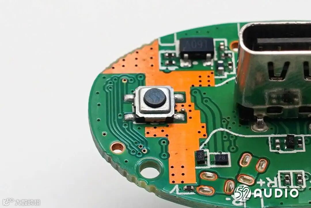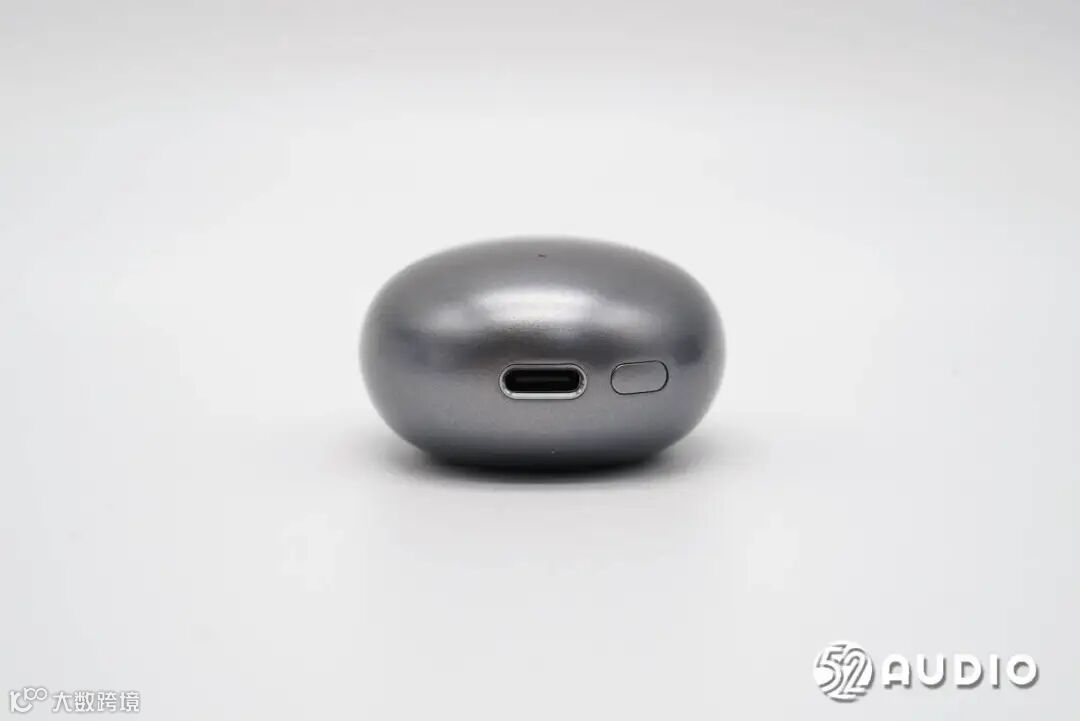 机身底部设置有Type-C充电接口,银色环装饰,同时提升开孔强度。右侧一颗蓝牙配对的功能按键。