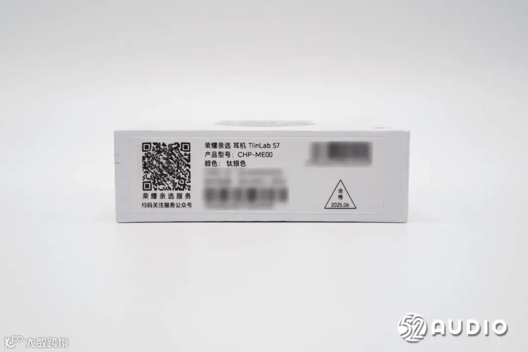 包装盒底部贴有产品出厂标签,荣耀亲选耳机TiinLab S7,产品型号:CHP-ME00,颜色:钛银色。