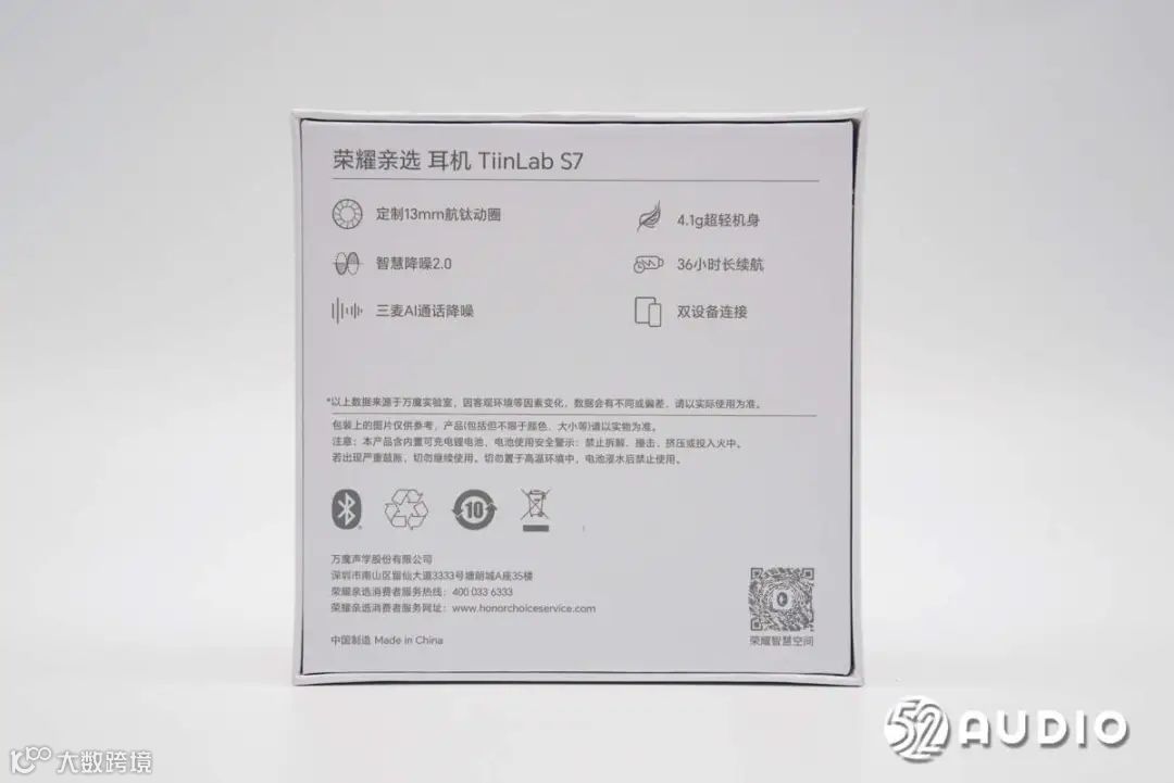 其他方面,荣耀亲选TiinLab S7支持蓝牙5.3,支持双设备连接,支持与荣耀手机弹窗配对,提供稳定、便捷的无线连接;支持游戏模式,提升延迟表现;支持查找耳机,防止丢失;支持IP54级防水抗汗,满足运动场景使用;耳机单次最长续航约7.5小时,搭配充电盒综合续航长达36小时,还支持快充,充电10分钟,听歌2小时。下面就来看看这款产品的详细拆解报告吧~