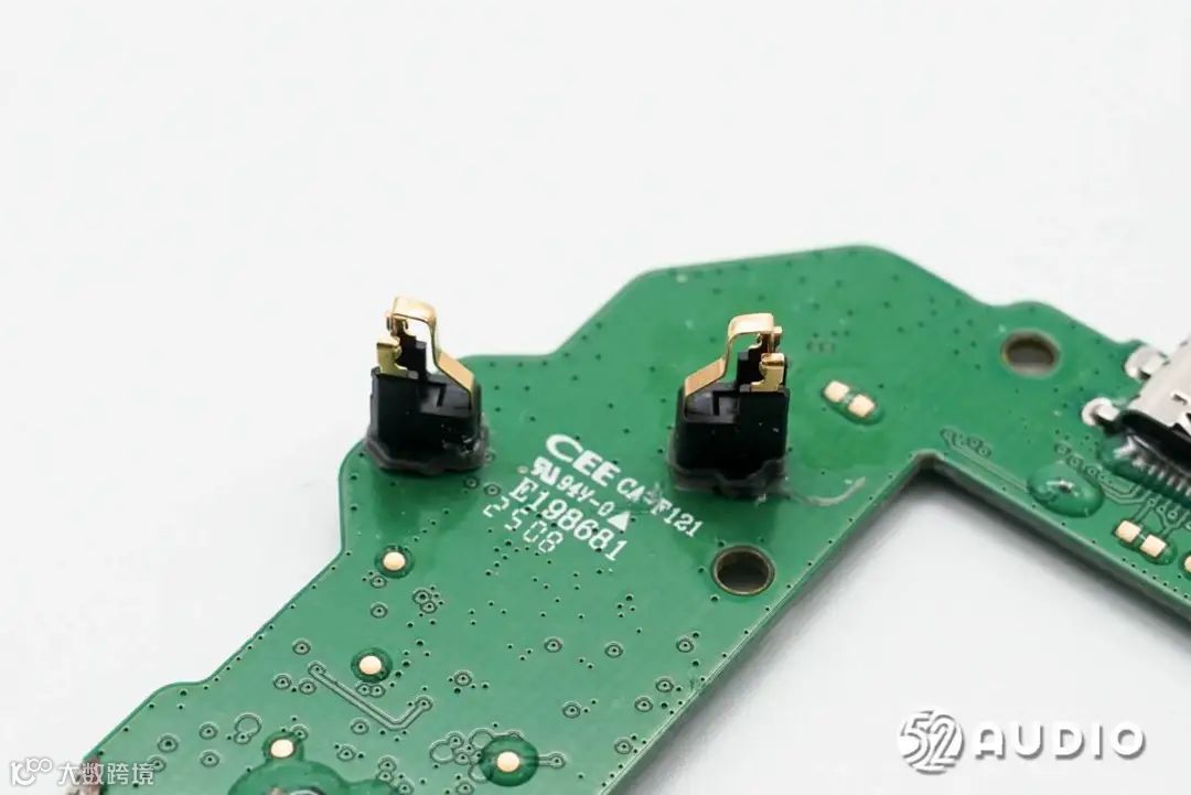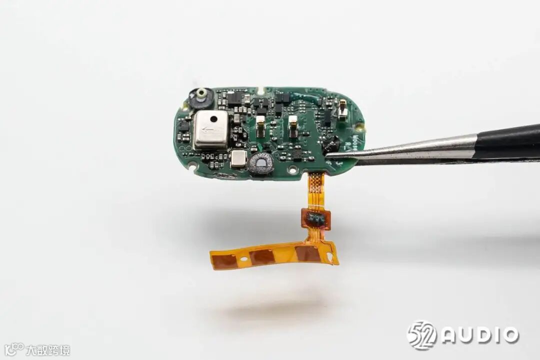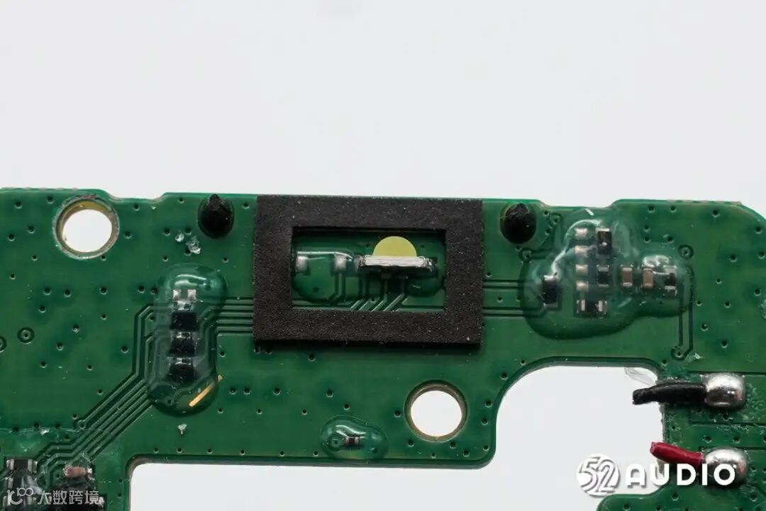 耳机主板一侧电路一览。两个麦克风拾音孔,设置有海绵罩和防水透气膜防护。