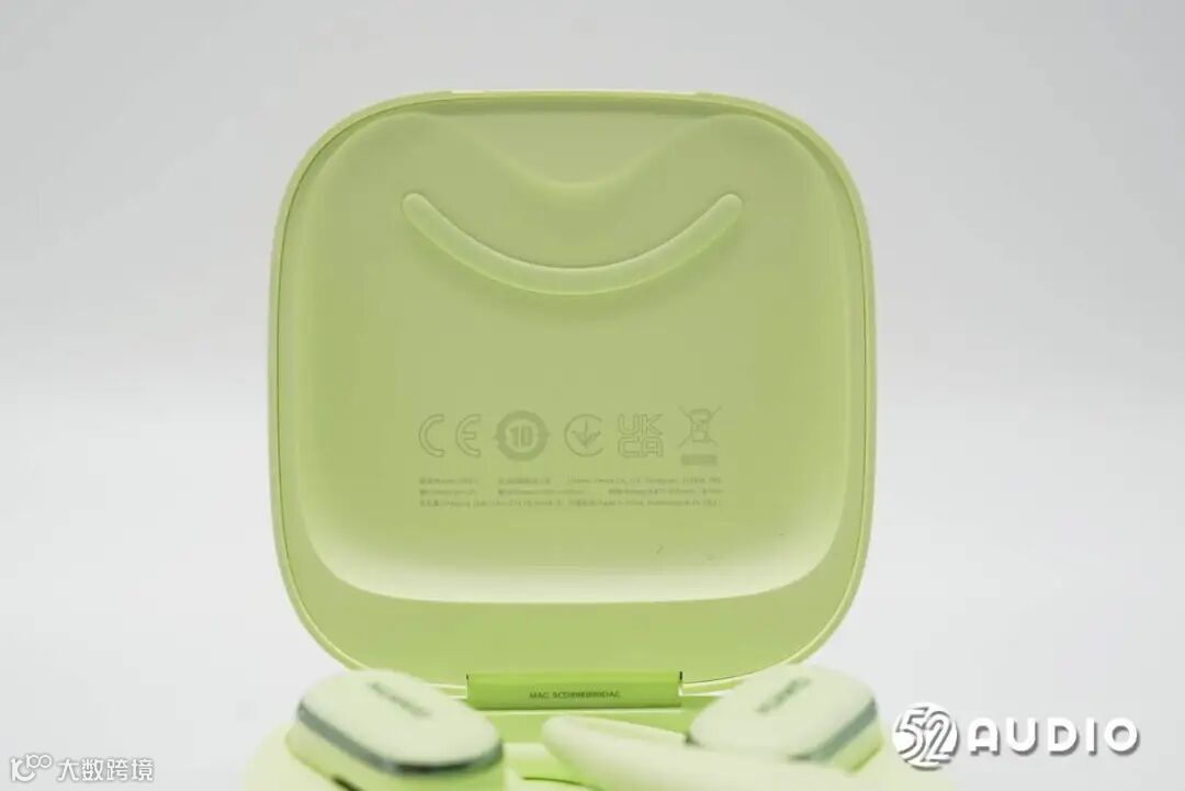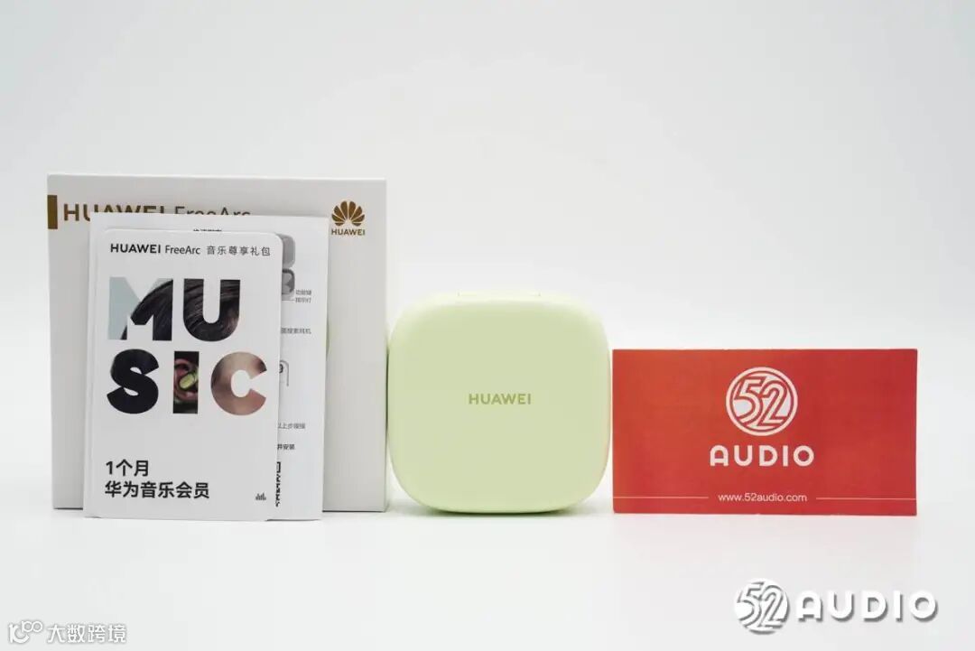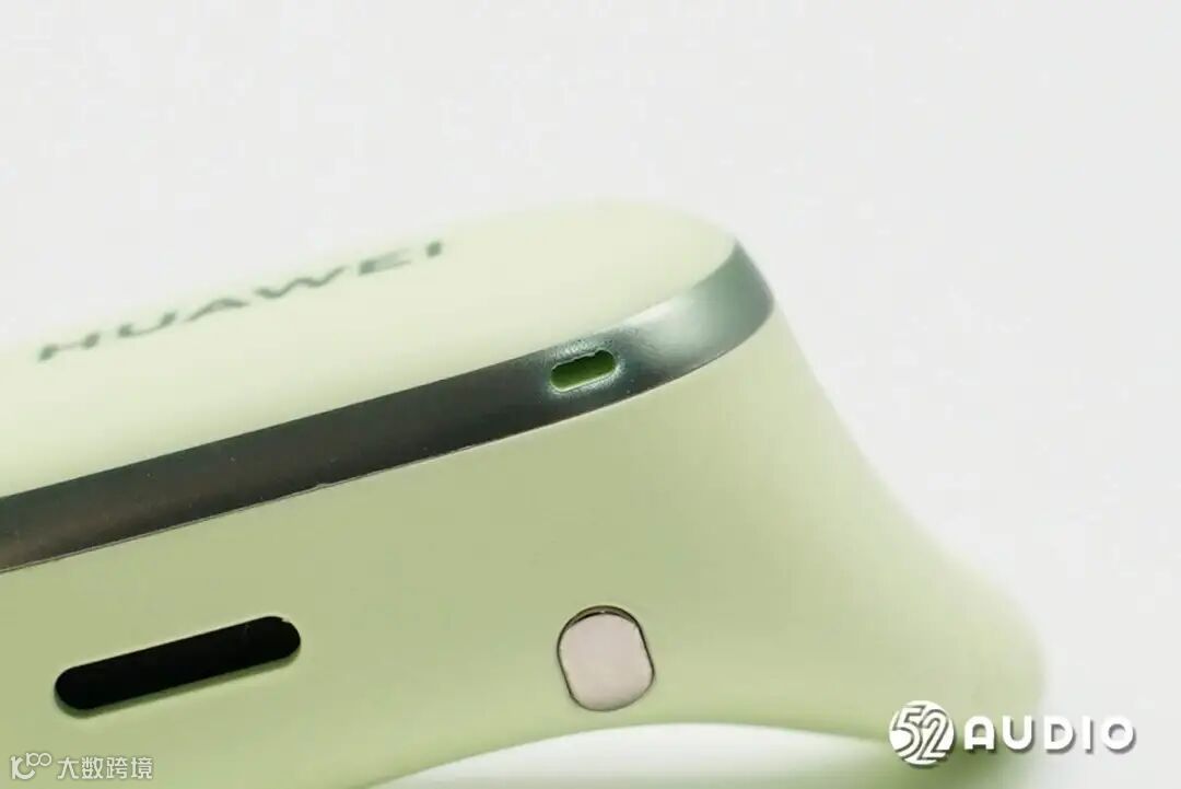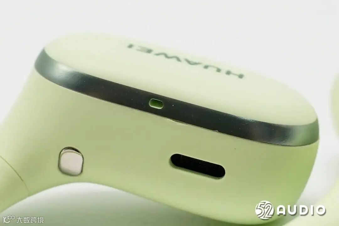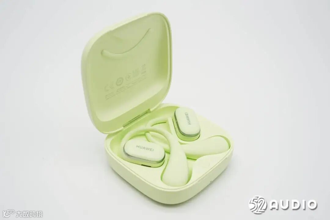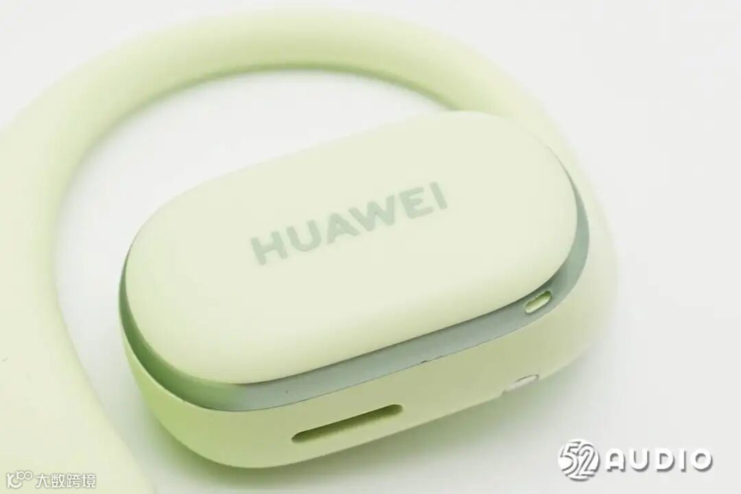 华为FreeArc开放式耳挂耳机充电盒采用了圆角方形设计,哑光质感,类肤质处理,触感舒适细腻;原野绿配色,非常清新。盒盖顶部设计有HUAWEI品牌LOGO。