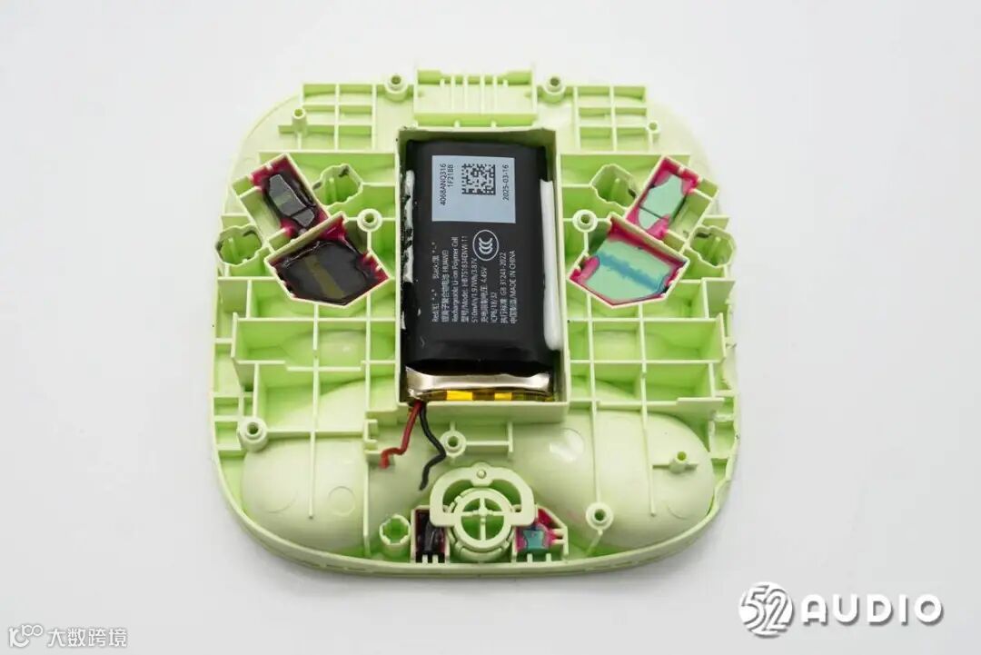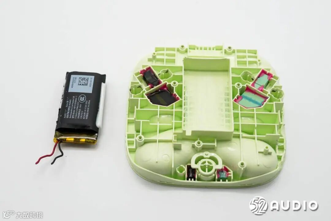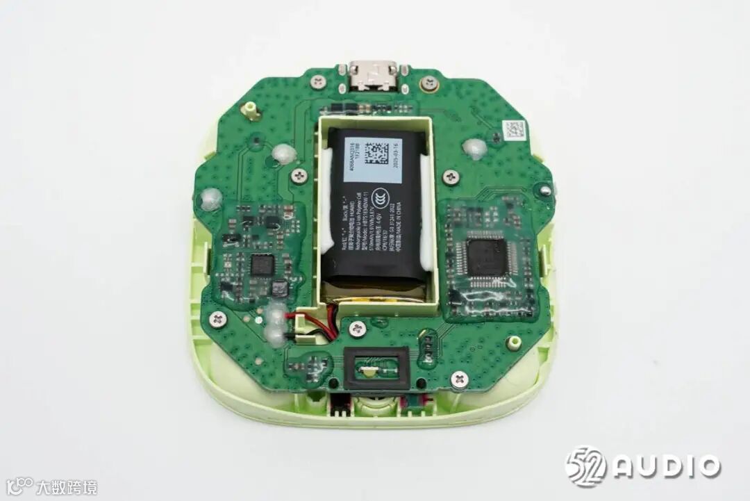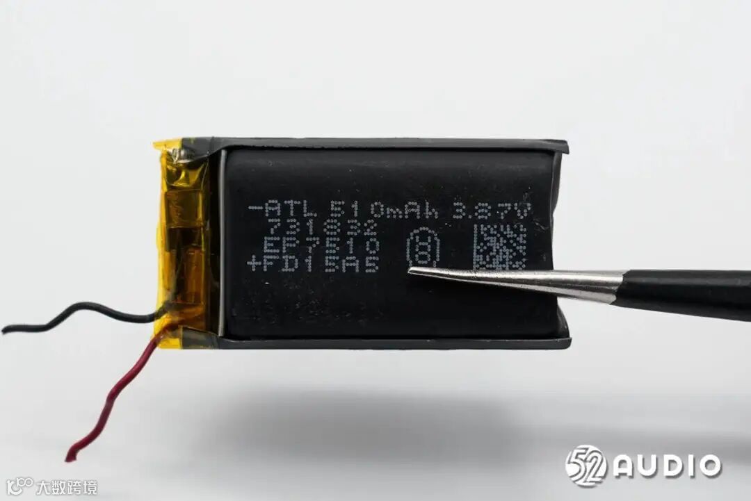 耳机内置钢壳扣式电池,容量:55mAh,标称电压:3.89V。