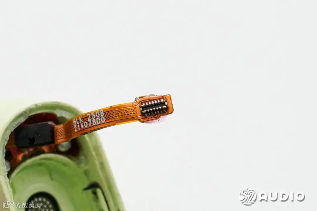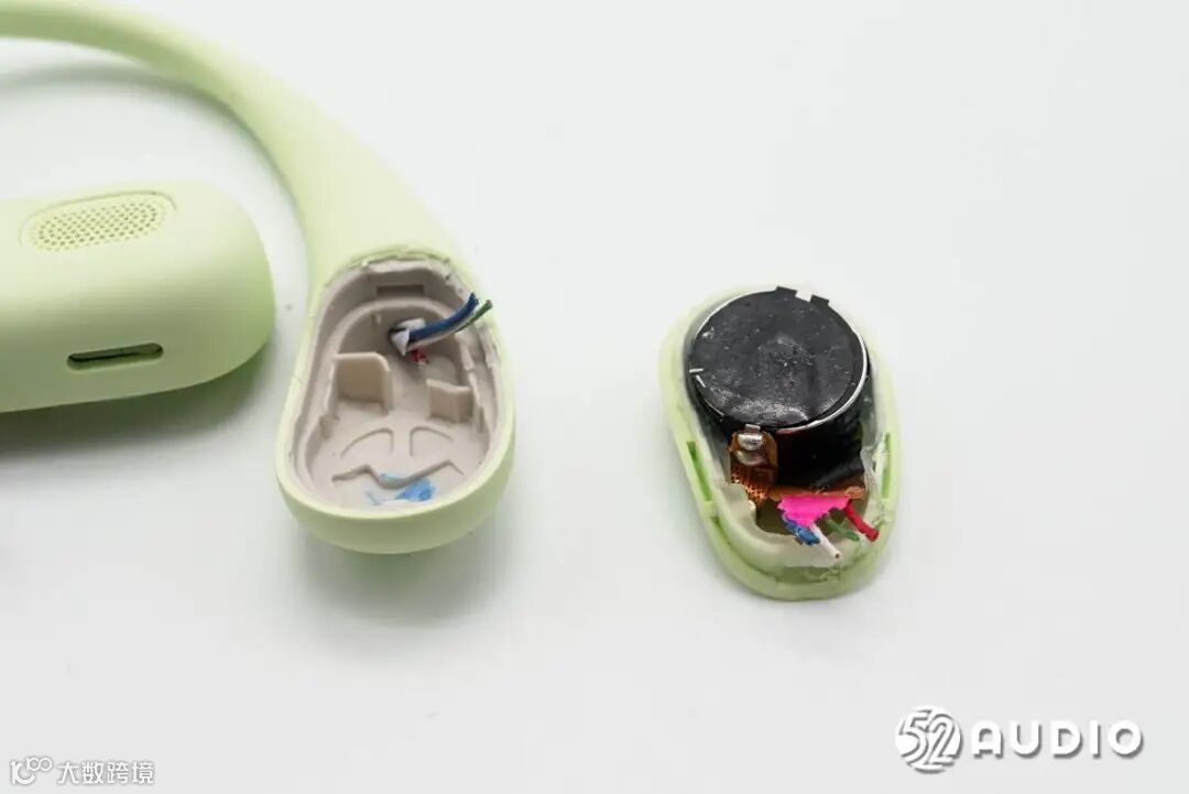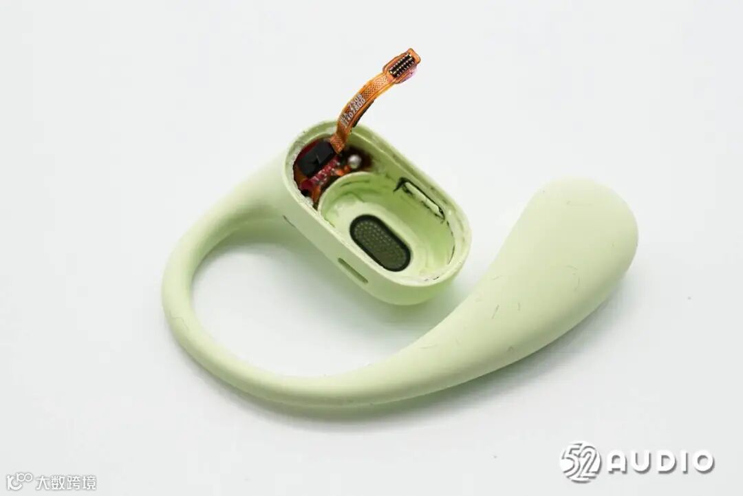 拆解耳机部分,打开音腔背部盖板,内侧有排线连接主板。