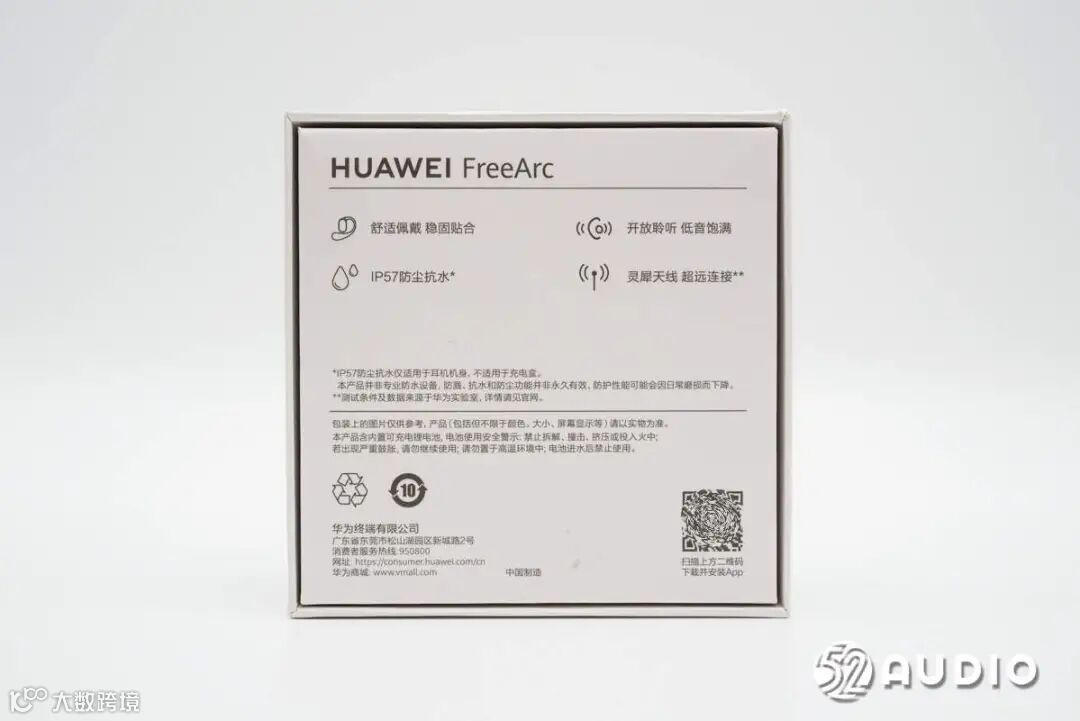 包装盒背面介绍有产品的功能特点:舒适佩戴 稳固贴合,开放聆听 低音饱满,IP57防尘防水,灵犀天线 超远连接;以及华为终端有限公司部分信息。
