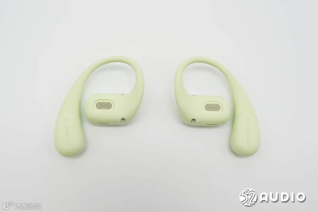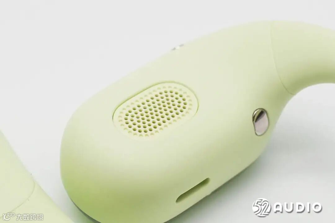 机身内侧外观一览,采用人因工程学曲线设计,佩戴与耳廓舒适贴合;同时采用140°三角稳固设计,能够进一步提升佩戴稳固度。