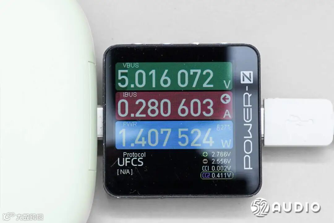 我爱音频网采用CHARGERLAB POWER-Z KM003C测试仪对HUAWEI华为FreeArc开放式耳挂耳机进行充电测试,输入功率约为1.41W。