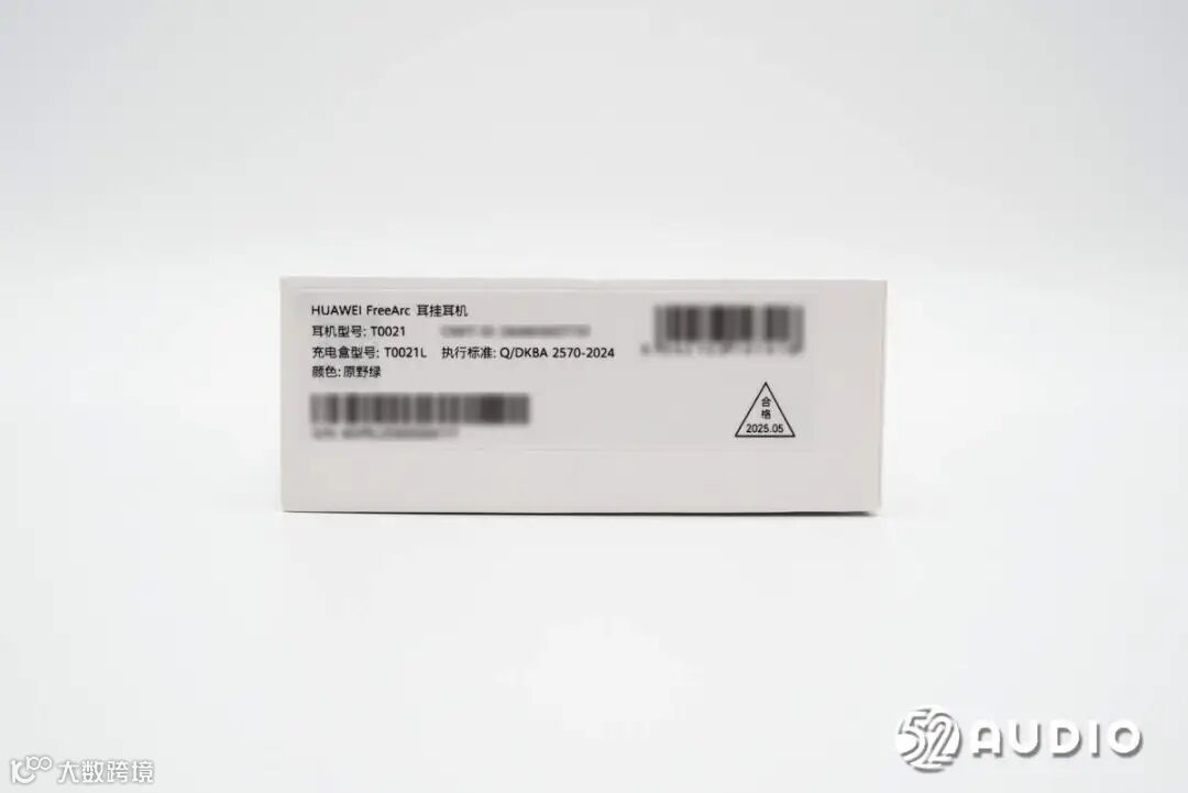 包装盒侧边贴有贴有产品标签,HUAWEI FreeArc耳挂耳机,耳机型号:T0021,充电和型号:T0021L,颜色:原野绿。