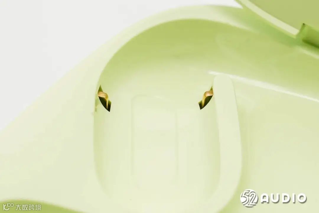 为耳机充电的金属弹片特写,设置有两组,对应两个耳机。