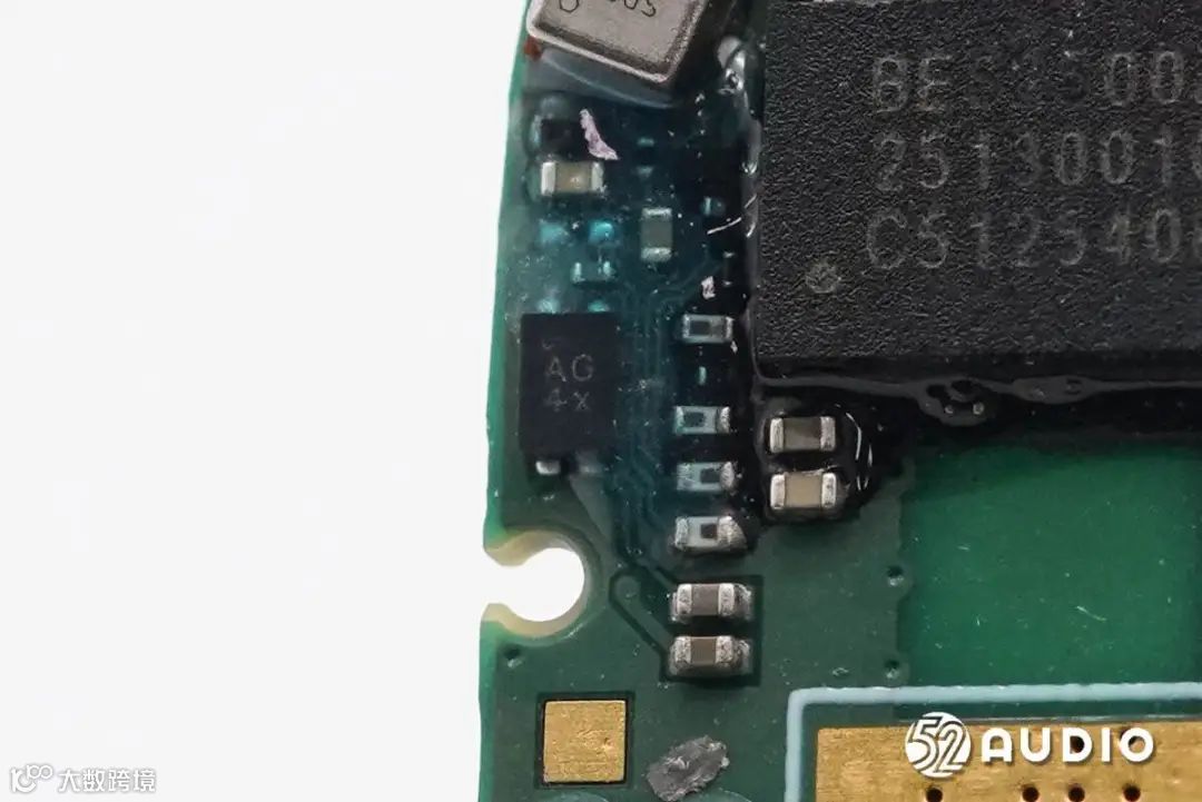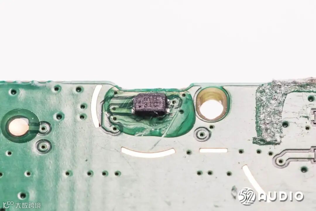 丝印mH 3iC的霍尔元件,用于感知充电盒开启/关闭时的磁场变化,进而通知充电盒MCU和耳机与已连接设备配对或断开连接。