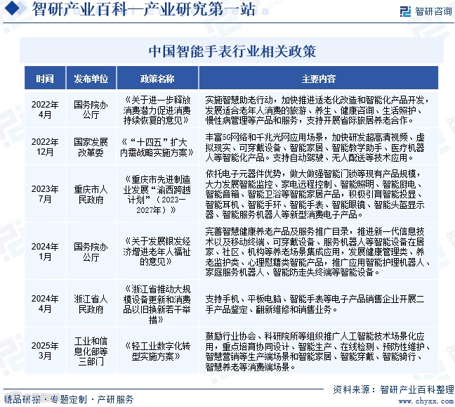 近年来国家和地方政府相继出台智能手表相关政策,物联网、人工智能、5G等技术的发展,智能手表等可穿戴设备迎来了快速发展期。国家政策支持产品研发,主要集中在促进智能手表行业发展、推广产品核心技术发展等领域。例如,2024年4月,浙江省人民政府印发《浙江省推动大规模设备更新和消费品以旧换新若干举措》,提出要支持手机、平板电脑、智能手表等电子产品销售企业开展二手产品鉴定、翻新维修和销售业务。2025年3月,工业和信息化部等三部门印发《轻工业数字化转型实施方案》,提出要鼓励行业协会、科研院所等组织推广人工智能技术场景化应用,重点培育协同设计、智能生产、在线检测、预防性维护、智慧营销等生产端场景和智能家居、智能穿戴、智能骑行、智慧养老等消费端场景。