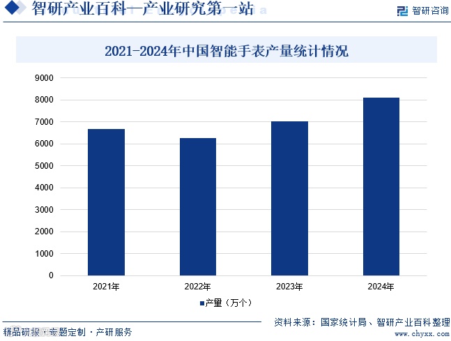 随着近几年智能手表的普及率提升,消费者越来越能够接受这种新型的智能穿戴设备带给我们的新体验,同时它也在引领智能产品的新潮流,智能手表已经成为继智能手机、蓝牙耳机后的又一现象级电子产品。近年来,在消费者对智能手表认可度持续提升和相关利好政策的实施和推动等因素共同作用下,我国智能手表行业整体发展良好。数据显示,2024年中国智能手表产量为8095.4万个,同比增长15.15%。我国智能手表需求仍有很大的增长空间,在国内消费水平的促进下,未来我国智能手表市场容量将保持稳定的增长态势。