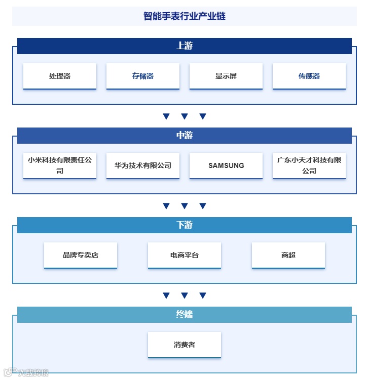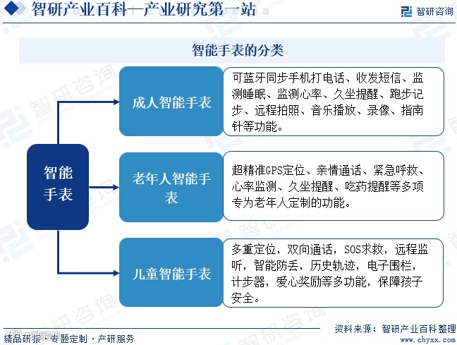 智能手表产业链上游为硬件和软件,其中,硬件包括处理器、存储器、显示屏、传感器、电池、无线通信模块等;软件包括操作系统和应用程序,系统可分为Watch OS、鸿蒙系统、安卓系统、Wear OS、TizenOS、RTOS等6大类。产业链中游为儿童智能手表、成人智能手表和老年人智能手表的生产制造。下游主要通过品牌专卖店、电商平台、商超等渠道流通到消费者手中。