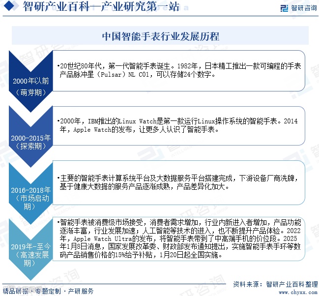 20世纪80年代,第一代智能手表诞生。1982年,日本精工推出一款可编程的手表产品脉冲星(Pulsar)NL C01,可以存储24个数字。2000年,IBM推出的Linux Watch是第一款运行Linux操作系统的智能手表。2014年,Apple Watch的发布,让更多人认识了智能手表。2016-2018年,主要的智能手表计算系统平台及大数据服务平台搭建完成,下游设备厂商洗牌,基于健康大数据的服务产品逐渐成熟,产品差异化加大。2019年以来,智能手表被消费级市场接受,消费者需求增加,行业内新进入者增加,产品功能逐渐丰富,行业发展加速;人工智能等技术的进入,也不断提升产品体验。2022年,Apple Watch Ultra的发布,将智能手表带到了中高端手机的价位段。2025年1月8日消息,国家发展改革委、财政部发布通知提出,实施智能手表手环等数码产品销售价格的15%给予补贴,1月20日起全国实施。