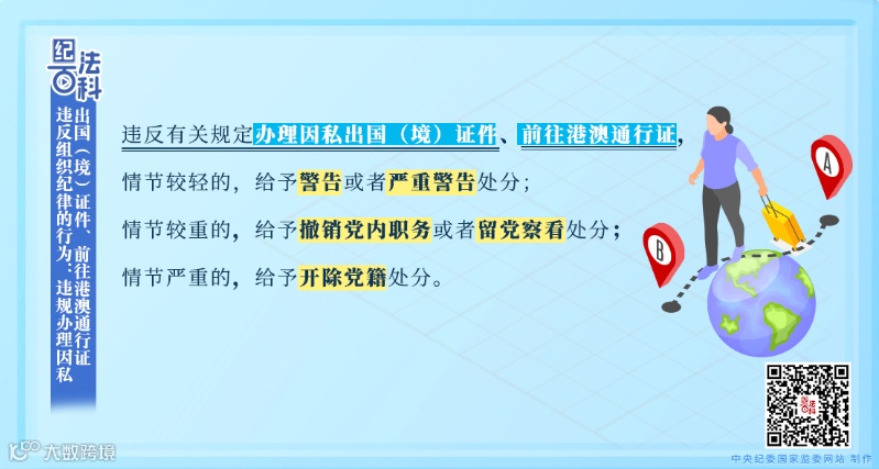《中国共产党纪律处分条例》第九十一条规定:“违反有关规定办理因私出国(境)证件、前往港澳通行证,或者未经批准出入国(边)境,情节较轻的,给予警告或者严重警告处分;情节较重的,给予撤销党内职务或者留党察看处分;情节严重的,给予开除党籍处分。”