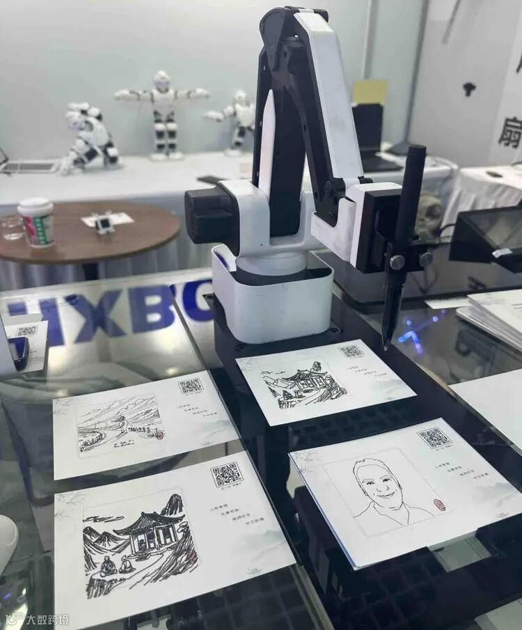 一款颇受欢迎的AI绘画机,接入了ChatGPT 4o,能够通过一句话或者几个关键词,让机器人自主生成并绘制图画,也可以通过拍照的方式,通过自主训练的人脸大模型生成机器人能识别的线稿图,然后通过末端在卡片或名片上绘画出来,目前市场2万一台的售价,年产出量在2000台左右。已经在欧美市场应用。