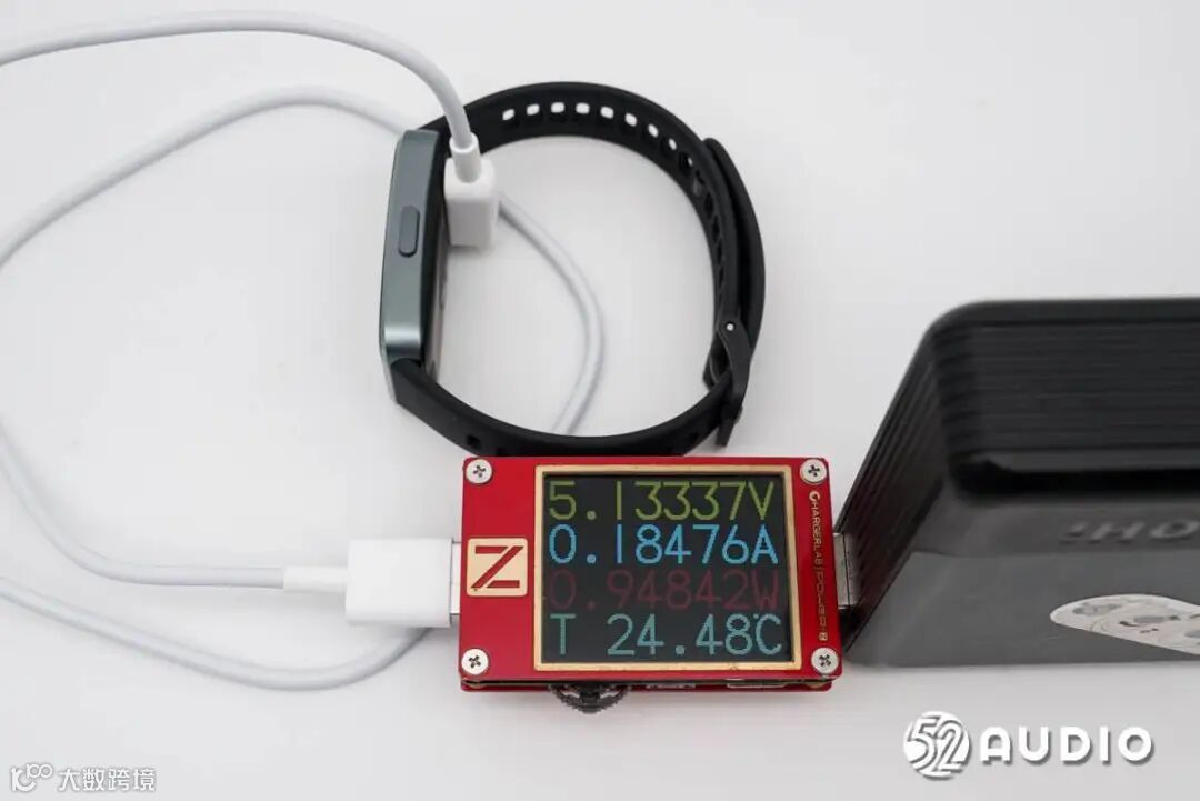 智研所采用ChargerLAB POWER-Z KT002便携式电源测试仪对HUAWEI华为手环10进行充电测试,输入功率约为0.95W。